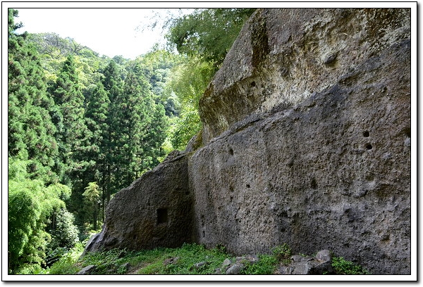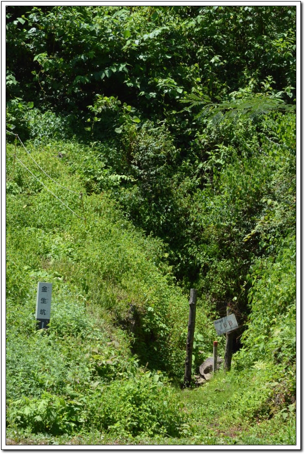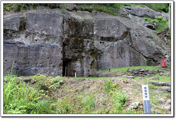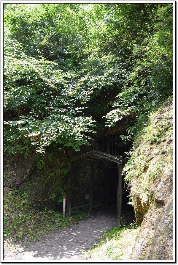 釜屋間步,因為內部危險禁止進入,只能看外觀。間步上方十字略帶黑色的部分是以前礦脈露出開採的痕跡。