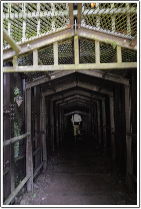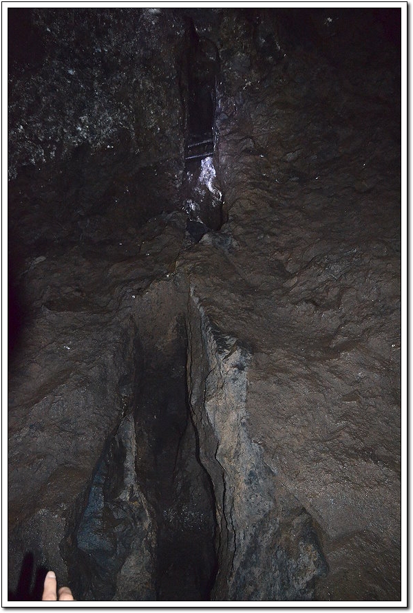 深入礦坑數百公尺後,來到盡頭一處豎坑,欄杆後有地下水在此直奔黑暗。