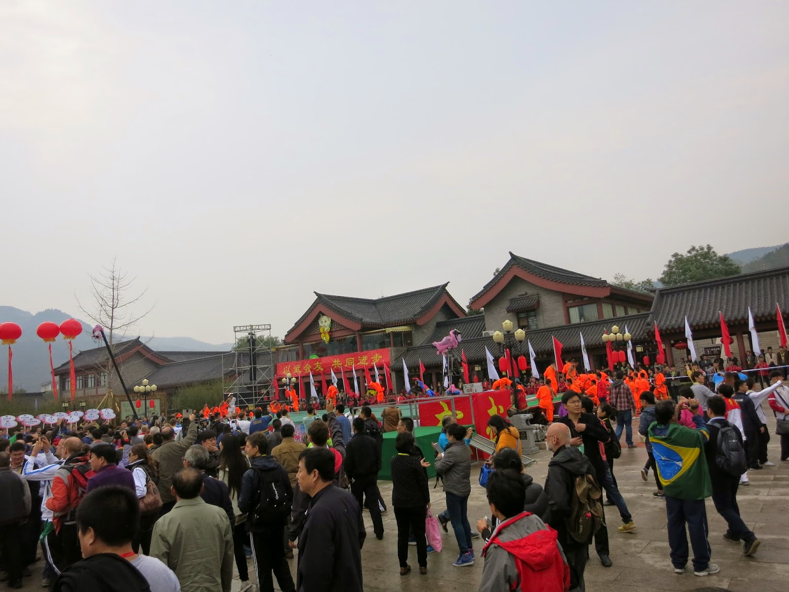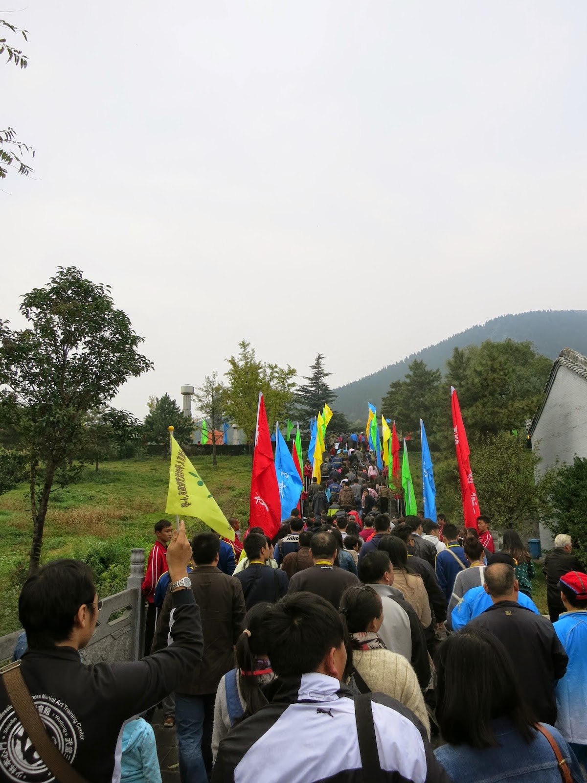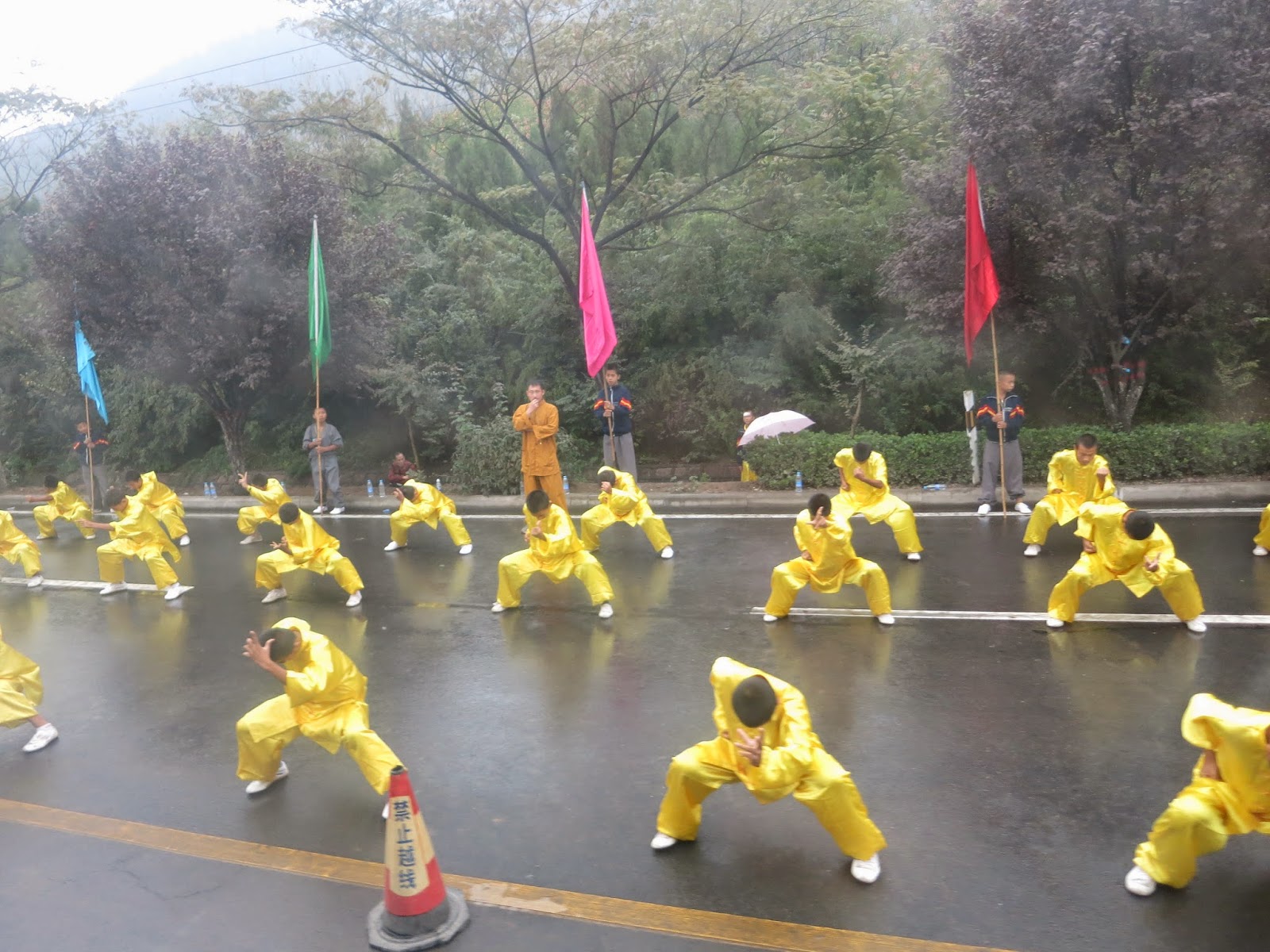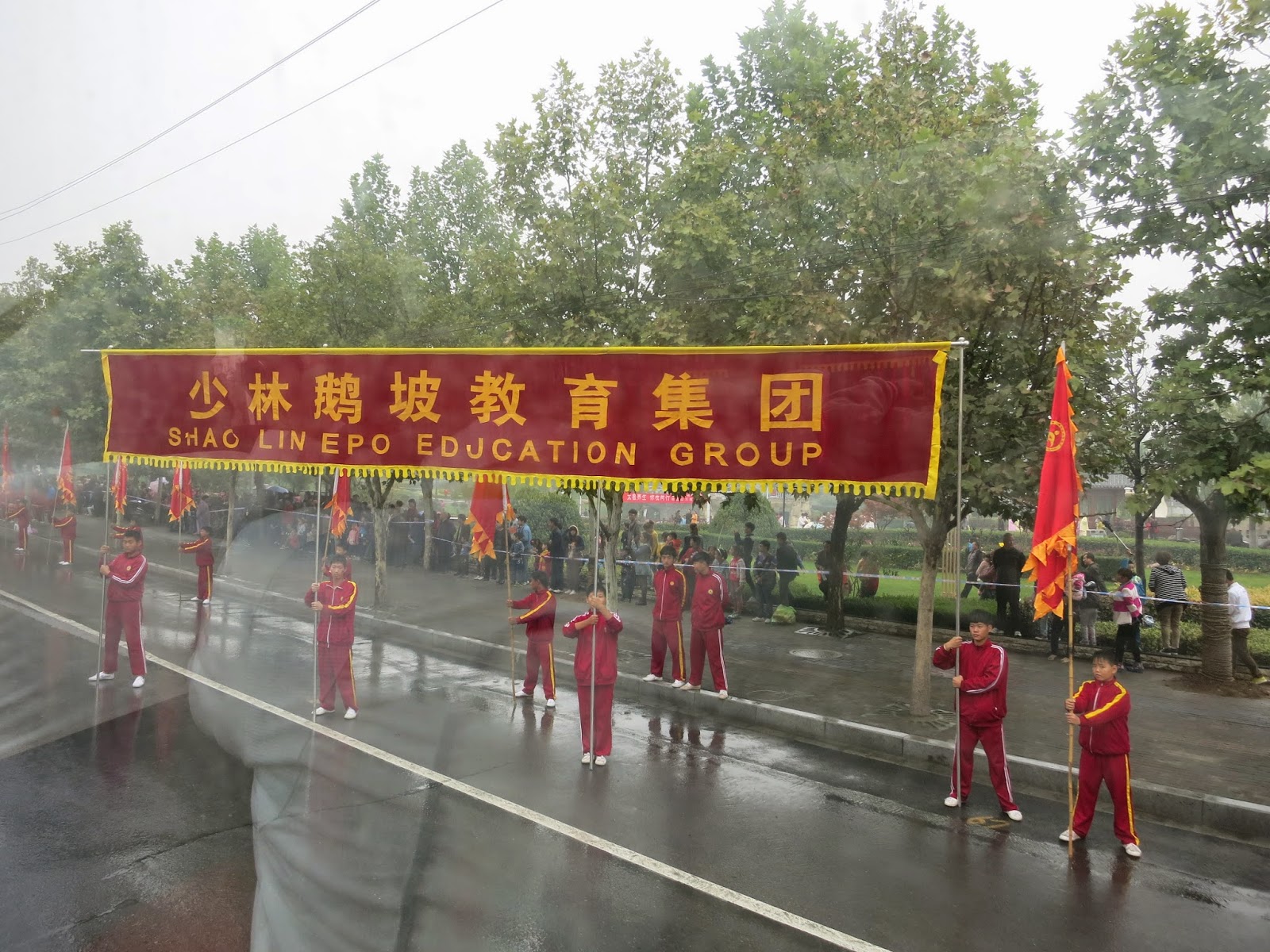 2014第十屆中國鄭州國際少林武術節遊記(三) ------ 少林‧登封一早起床,我們每個人都非常的興奮,因為我們下午就要出發前往少林寺參加這次國際少林武術節的開幕儀式,可是無法與台灣聯繫的我還是一件無法解決的麻煩事 情。慶幸陳老師有攜帶筆記型電腦出門,昨晚是有用他的電腦上網回覆家人報平安,可是總不能每天都給別人添麻煩吧?因此,趁著還有一點時間,我與林老師一起 「打的」出發前往鄭州市區找通信業者申請一張臨時的電話卡。在大陸,「距離」的定位真的與台灣差異甚大,一樣是市中心我們從住的地方前往比較大型的電信業者的門市還得開車將近20分鐘才能抵達。而且大陸的空氣糟糕實在得講三遍,因為真的太糟糕了!天空永遠有一層灰矇矇的霾,台灣出來嬌生慣養的我們馬上感覺到整個鼻腔的不舒服... 大陸的「打的」就是計程車的意思,而他們的計程車也是跳表計費,還可以使用app來叫車喔!整體都跟台灣差不多,唯獨不同的是中間隔著一個鐵欄杆... 害我們在搭車的時候感覺自己好像因為犯罪而上了囚車的犯人。河南腔有著大家熟悉的北方腔調的感覺,對他們而言我們來自台灣的獨特國語口音也覺得好奇,因此 這幾天每次坐計程車司機都會或多或少問我們打哪來?然後聽到我們來自於台灣更會興奮的問我們:台灣計程車司機賺得多嗎?台灣房價也很高嗎?台灣人生活如 何... 或許政治上大家有各自的堅持或是立場,但是平民百姓來說大家關注的還是一樣的事情啊。 來到市區,總算看到了大陸的「中華電信」,也就是她們的「中国移動」趕緊辦了一張卡。大陸這裡的電信不是月租費而是儲值扣款,因此打多少就用多少。只為了滿足基本行動上網與撥打臨時電話回台灣,我申辦最便宜的方案花了人民幣160元申請了一張卡。 看到後來手機可以接受訊息與撥打頓時真的高興到不行。 原本準備要回飯店準備了,怎知在旁邊看到更多讓我喜悅的東西。 「肯德基!」、「家樂福」還有還有... 「星巴克啊!!!」二話不說立刻衝進去點了杯咖啡...頓時覺得,自己總算活了過來。 (這就是人生啊) 一早來了一個小副本插曲並沒有影響整體的行動,回到了飯店看到其他國家的選手與老師也紛紛起床開始做準備。眾多團隊當中其中有一群帶領小朋友的「新武門」立刻吸引了眾人的目光。 他們的老師聽講中文的口音是來自大陸,但是教導孩子的時候都是全程英語,而學生通通都是金髮碧眼的孩子。他們大方的在飯店空間練拳打功夫,就連不屬於他們團隊的其他成員都紛紛過去看著他怎麼教孩子功夫。 這是一個非常珍貴的經驗學習,可以吸收其他團隊的老師怎麼指導學生,一邊看一邊也深深佩服。這位老師充分掌握住兒童年齡學習的節奏與強度,他的過程中讓孩子動作依然紮實但是大家還是充滿笑聲並且孩子勇於即時舉手請問事情,真是個好老師啊! 「各位準備出發啦!」隨隊的翻譯們已經獲得主辦單位的訊息之後開始紛紛整隊開始搭車準備出發前往這次大家最嚮往的目標「登封少林寺」。還記得我說過大陸的距離跟台灣有差嗎?今天早上我曾問過司機說少林寺遠不遠?司機輕鬆的說:很近,沒有很遠。 當我總算擁有上網的功能也上了車查了一下從我們這裡出發去少林寺的距離... 133 km ... 原來,在大陸開車兩個小時內的都叫做近啊。(後來司機還說洛陽很近...開封很近...要我們一定有空要去逛逛,我再也不信了) 這次的活動是高規格的禮遇,因此我們整個車隊一路下來有警車開道,路口也有警察協助交通引導並且綠燈到底,假如是台灣有這種安排可能都被當地住戶罵死了吧?真的不愧是集權政府啊。 下午的天氣開始轉濕冷,外面開始飄起了小雨,這一路車子直直的開,我們的心也一點一點的雀躍了起來。少林寺到底長著什麼樣子?真的有如小說那樣的神奇?還是有如台灣武術老師不屑的商業銅臭?看著一路上一成不變的風景,心裡也不斷的犯嘀咕。 鄭州前往少林寺必須要走「少洛高速公路」,我們下了交流道馬上看到的是相關的標語,車上其他國家的人也開始一點一點騷動了。因為我們總算快要接近目標了。 整個登封縣因為少林寺帶動武術市場,所以武術教學與觀光產業成為他們整個縣市主要的收入來源之一,這裡的馬路甚至直接用此為名,可想而知這背後有多大的產業鏈在運作著。看著他們整個入城市前的一個大型看板,誰說武術不能夠成為一個大產業呢? 我們開到了一間武校外大家開始興奮的拿著手機與相機拍攝著這碩大的武校,但是後來才發現這只不過是山腳下的一間「武校分部」,塔溝武校是少林寺旁邊眾多武 校當中數一數二的大學校,整個武術學校綿延整個少室山的路上。原本聽說有幾百間武術學校,但是這裡我看到的都是幾個超大型的武術學校集團,或許隨著這段時 間的經營與運作,資本主義也逐步的改變了這邊的武術生態吧?我們在這裡停頓了將近二十多分鐘,大家開始不解為什麼整個車隊要在這裡停下來呢?小朋友們也開 始不安了起來。 等待總是值得的,車子總算開始緩緩的始動了,我們探頭探腦的往窗外看,沒多久車上不安的交談轉換成驚呼與讚嘆,這是什麼啊!!! 整條往少林寺的路上一群又一群的迎賓隊伍整齊的排排站,他們冒著細雨耐著低溫在路上為了我們的車隊一遍又一遍的打著武術動作展現出他們的氣勢與精神,車上所有人看到這情景都傻