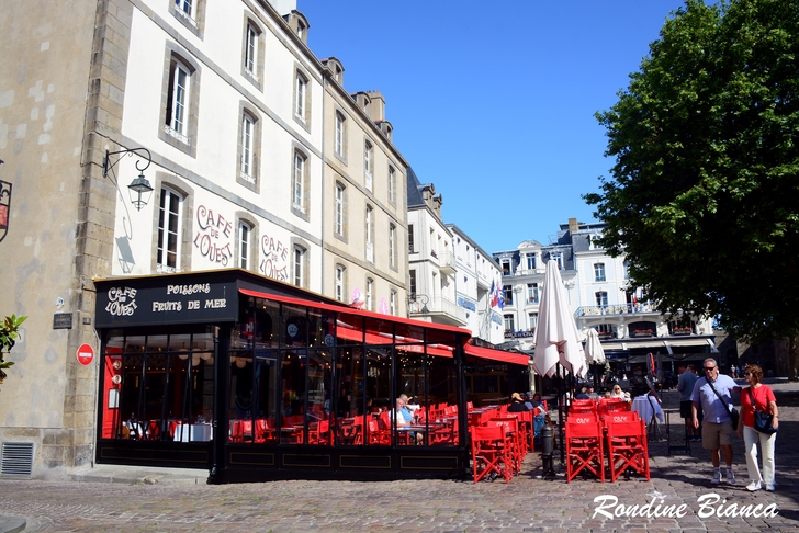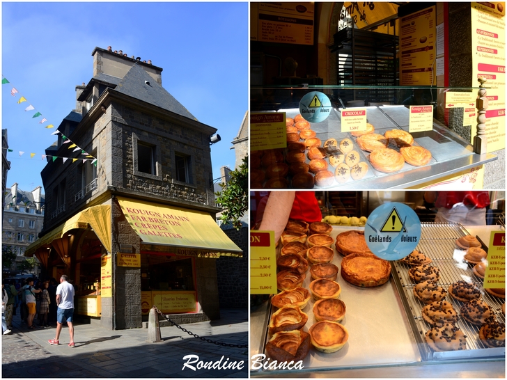 狹窄的鵝卵石街道兩旁林立著吸引人的商店、咖啡館,二戰後修復的城市建築外觀整潔簇新。對於聖馬洛這座古城神往已久,但眼前所見與想像有著落差,或許就是少了點兒了古城應有的歷史風華吧! 聖文森教堂的尖塔是個美麗的地標,迷走在曲折蜿蜒的巷弄之間,只要一抬頭便能找到正確座標。 這是一家聖馬洛知名的傳統糕點店,販售布列塔尼傳統手工甜點。隨團領隊請大家品嘗,選了經典的奶油酥 (Kouign Amann),布列塔尼是法國奶油的重要產地,奶油酥確實香濃,但稍嫌甜膩厚重!