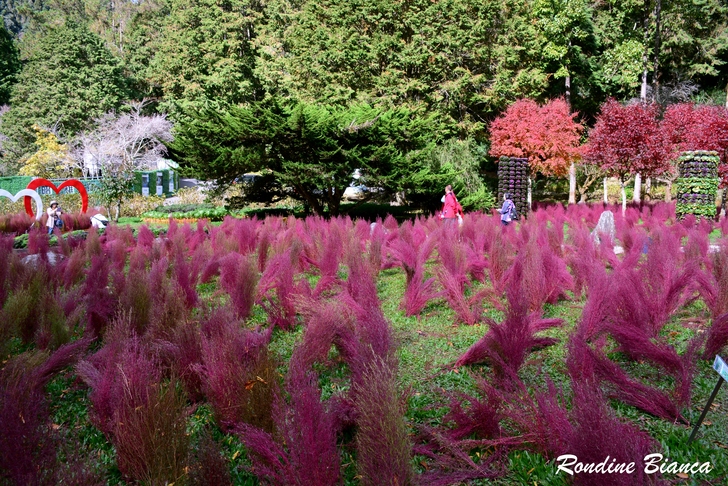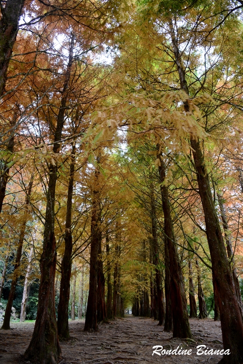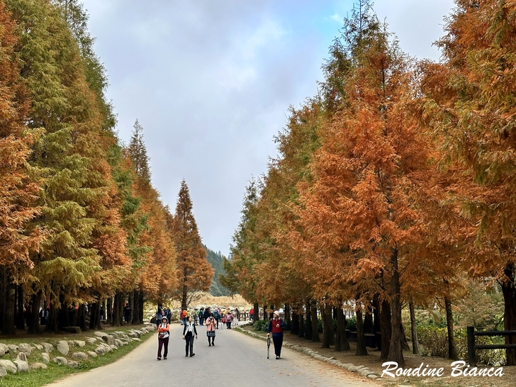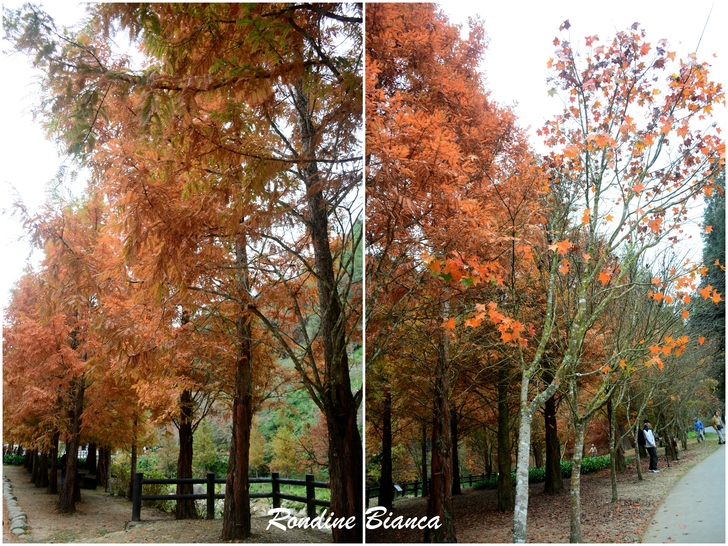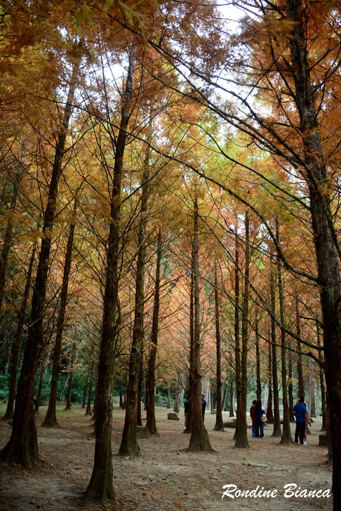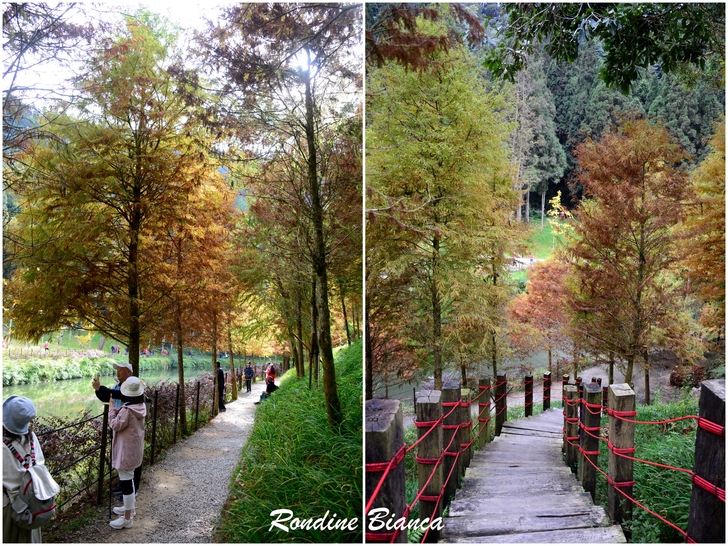 園區在花卉中心大規模種植了 6000 棵可愛的波波草,打造一片夢幻地景。波波草又名「掃帚草」,株形修長、風姿獨具。春夏時為充滿生機的翠綠色,隨著秋意漸濃,氣溫轉涼,植株將從莖到葉漸層轉紅。在蒼翠的山林之間,一整片嫣紅的波波草隨風搖曳,與銀杏、楓葉及水杉遙相應和,眾色喧嘩的自然美景,讓杉林溪的秋冬絲毫不寂寥。 黃金水杉林 夢幻的金色森林 水杉素有植物王國「活化石」、「天下第一杉」之稱。屬於落葉喬木的水杉,在台灣非常稀有。秋冬時葉子由深綠漸漸轉換成淺黃,再慢慢變成金黃和橘黃,最後變成紅褐色。 原先以為水杉就是落羽松,但其實不然。「水杉的外觀是與落羽松有點相似的羽狀排列的小葉。但水杉的線形葉和側枝都是對生,而落羽松的葉子在脫落性側枝上互生。」——杉林溪森林園區官網上如此說明,但我還是有看沒有懂! 這片黃金水杉林也是杉林溪最膾炙人口的景點之一,高大茂盛的水杉林,此時金黃與橘紅交織錯落,抬頭仰望,柔美懸垂的樹葉在林間織起一張華麗的簾幕,既浪漫又夢幻!