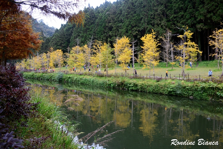 銀杏湖畔的坡地上廣植銀杏樹,深秋時節成排金黃的銀杏明亮耀眼,背襯墨翠杉林,茵茵綠草鋪地,還有橘黃水杉輝映,色彩繽紛、層次分明的美景難得一見,令人讚嘆不已! 陽光灑落,照亮山林也照進遊人心間。在墨翠杉林的襯托下,金黃色的銀杏益發光彩奪目,倒映水中為青山綠水增色添彩,幽靜的山林因此而熱鬧鮮活,動人的美麗秋色直教人心醉神迷! 小巧細緻的楓葉,以紅黃橘綠的斑斕色彩壯大聲勢,陽光下樹葉剔透如璀璨寶石,在杉林溪畔的枝頭閃亮招展,它是秋冬山林獨領風騷的最佳主角,妝點青山綠水是它最美麗的宿命。一邊按下快門,一邊讚嘆造物的神奇! 跨過安和橋,來到銀杏湖彼岸的銀杏林。「銀杏湖」是園區的人工造景,廣濶的斜坡地上種植了大小銀杏百餘棵,最大的樹齡高達百年,不同樹種層疊錯落,在冷風吹拂下一一換上金黃衣裳。 相較於楓葉,澄黃的銀杏似乎更加珍稀。疏林如畫,曲徑通幽,加上藍天白雲輝映,眾人歡欣雀躍盡情徜徉在這片橙黃橘綠交織的詩情畫境中。
