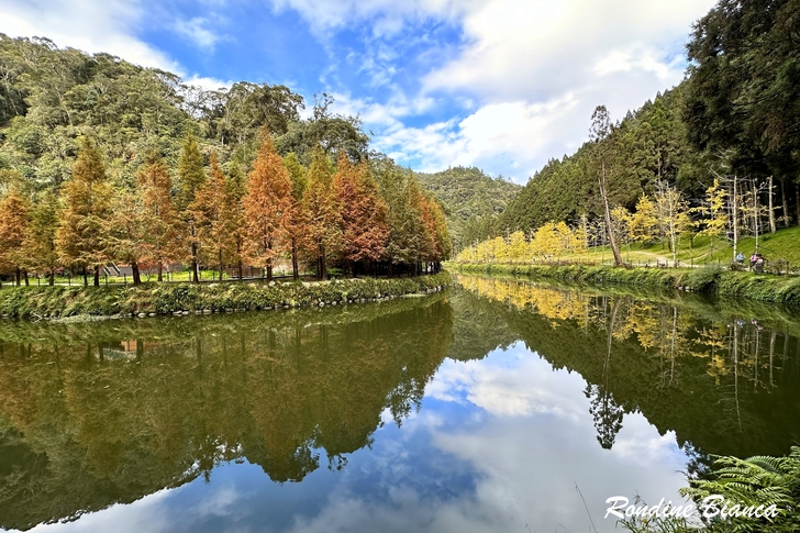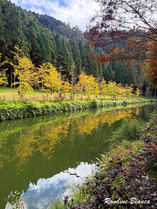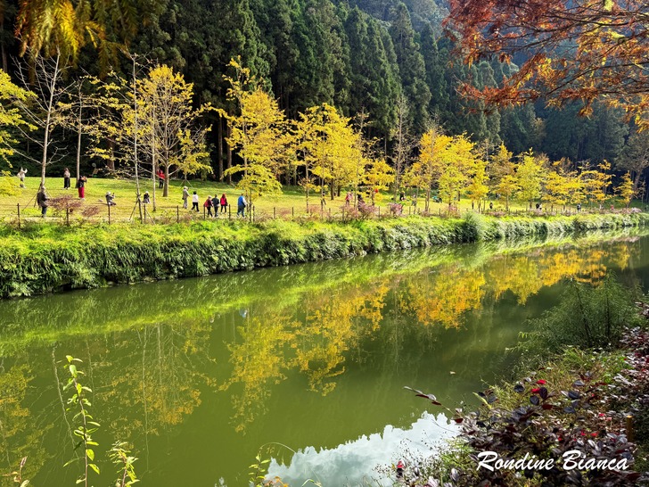 在松瀧部落午餐,冷冷的天氣中坐在戶外區享受一杯熱騰騰的泡麵,竟是如此美味;還有麵包、甘蔗雞、肉乾、水果…眾人的愛心讓大家果了腹也暖了心。上樓再喝杯氤氳飄香的咖啡,享受閒逸的山林意趣,竟連松瀧瀑布也不想走動了,索性閒逸(耍廢)到底! 臨去秋波 臨去依依,再度來到銀杏湖。午後少了陽光,但這一片黃澄澄的銀杏林依然令人迷醉。嬉遊間友人問道:「今天有比昨天漂亮嗎?」,我回:「時時都有不同的美!」相逢不知何時,把握機會盡情徜徉! 縱橫交錯的枝椏,撐起漫天開展的黃葉,有的依然一樹繁華,有的已然華麗謝幕,先來後到生命交疊,也是自然的美麗法則。無須唏噓,且把握眼前的澎湃美景,牢記這一季的錦繡繁華! 一年好景君須記 最是橙黃橘綠時 一場被颱風吹散的杉林溪秋色饗宴,在初冬時節圓滿彌補回來了。銀杏依舊傲冬風,楓葉水杉相映紅,甚且藍天白雲風和日麗,果然是「來得早不如來得巧」啊! 「葡萄緣六人行」結緣於 2018 年的葡萄牙秋旅,那年春天先在杉林溪暖場。時隔七年餘,今(2025)年初冬再度攜手同遊杉林溪,歲月無恙,你我安好,感恩如此的因緣與恩典! 「一年好景君須記,最是橙黃橘綠時。」青春流逝,我們已然走到人生的初冬,但一年當中最美的景緻正是橙黃橘綠的初冬時節,一如我們攜手共享此刻的豐盈與美好。且讓我們珍惜相伴,期盼年年「把酒祝東風,且共從容」!