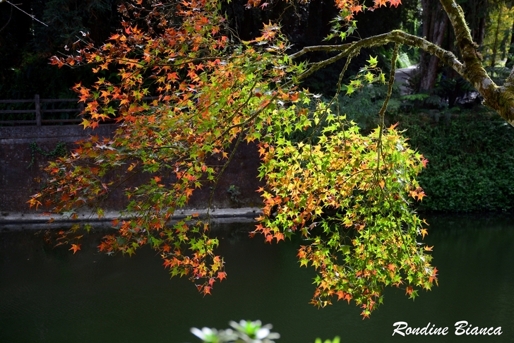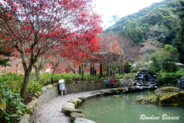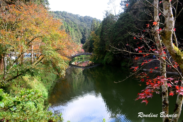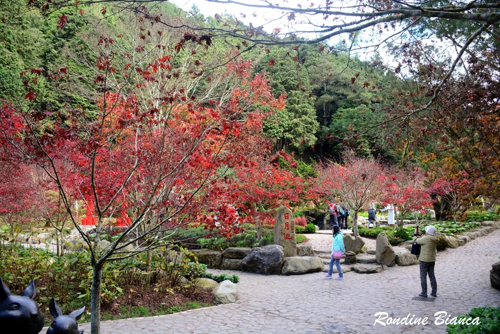 走過「八八吊橋」,遠眺「石井磯」,然它們無法讓我駐足停留。蜿蜒流淌的杉林溪,兩岸盡是青楓、紅檜、柳杉及原始森林,溪畔的山光水色、綠波倒影緊緊攫住我的目光,橘紅水杉與碧綠秋水交織的景色牽引著我的腳步! 好友幾人難得聚攏,晚餐後照例是我們促膝漫談、把盞言歡的溫馨時光。滿室溫暖的歡聲笑語中,渾然不覺飯店戶外只有攝氏10度的低溫。 2025/12/04 晨起陽光燦爛,飯店門口幾株金黃銀杏在晨光中熠熠生輝,又一天美麗的開始。 日月池畔 霜葉紅於二月花 杉林溪園區栽植青楓、紫葉槭、楓香等楓葉品種數千棵。時值秋冬季節轉換,日夜溫差變化劇烈,楓葉也換上華麗秋裝。配合楓紅季節,杉林溪園區打造一座賞楓景觀區,並以日月山水為概念,闢設兩座人工湖,名曰「日月池」。 日月池畔遍植紫葉槭,奼紫嫣紅層疊錯落,即使時序已進入初冬,那艷麗的紅妝絲毫尚未斑駁,依然楓情萬種絢麗動人。「花少不愁沒顏色,我把樹葉都染紅」,誰說冬天蕭瑟?但看這漫山遍野的楓紅,足教人為之沸騰!