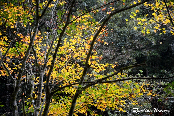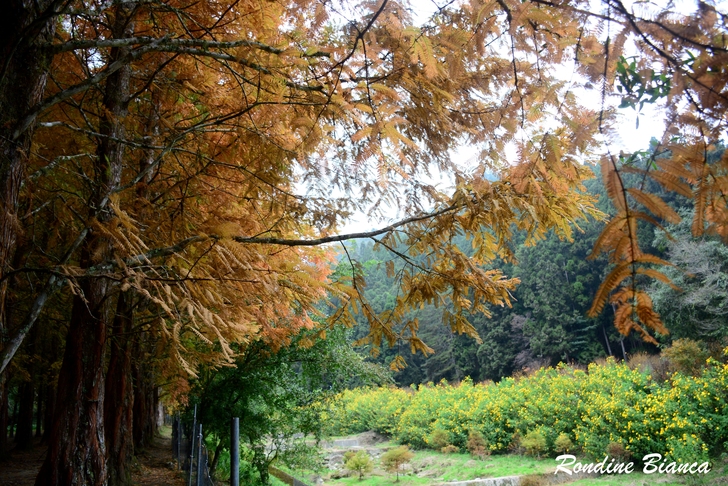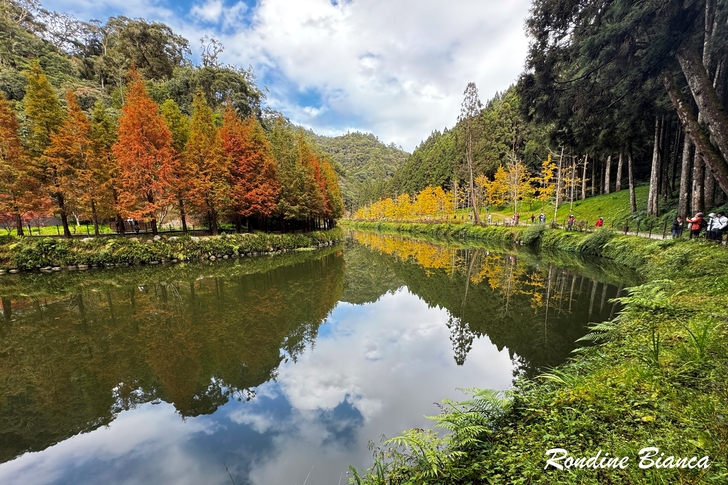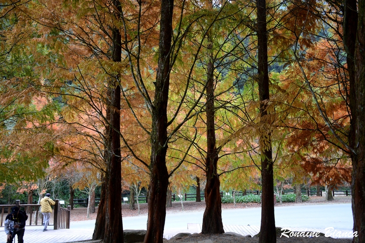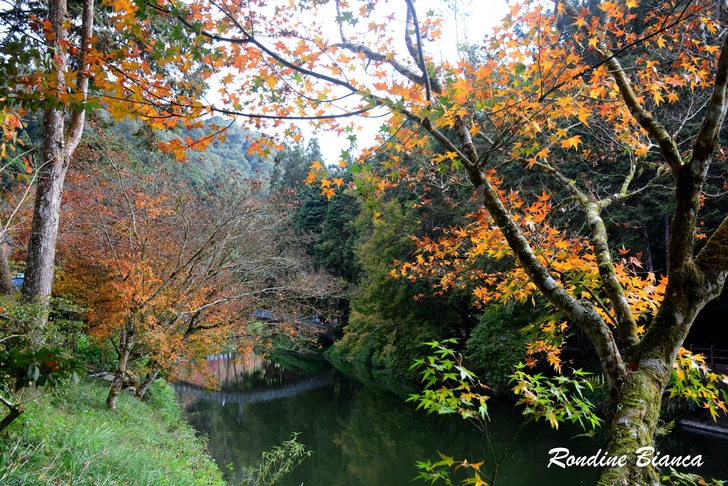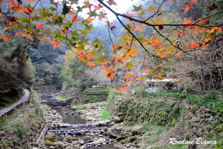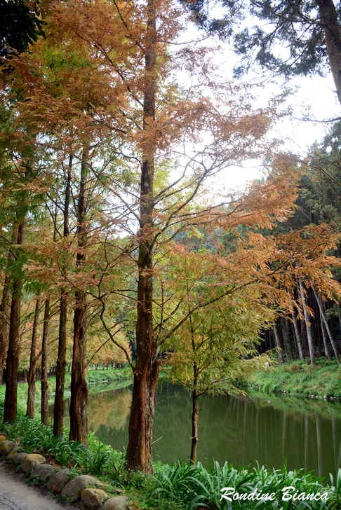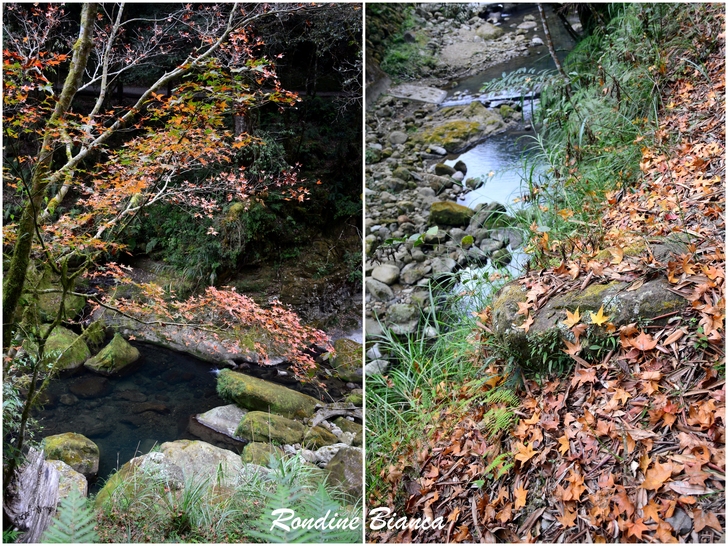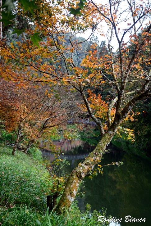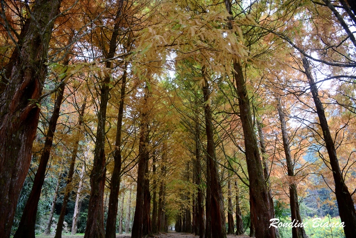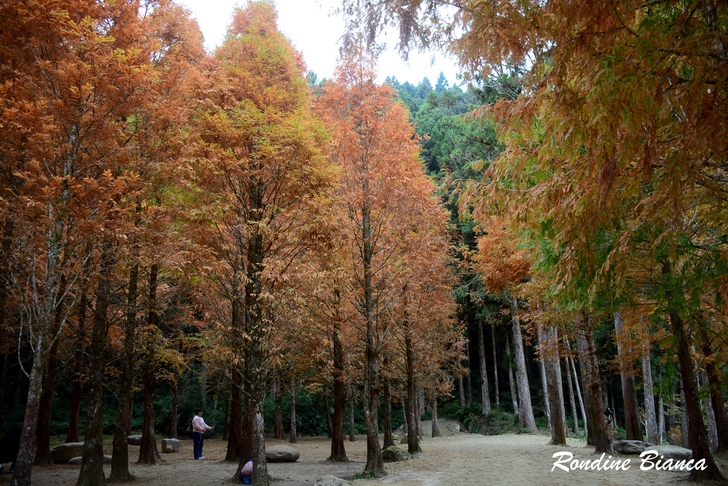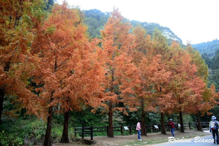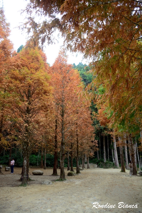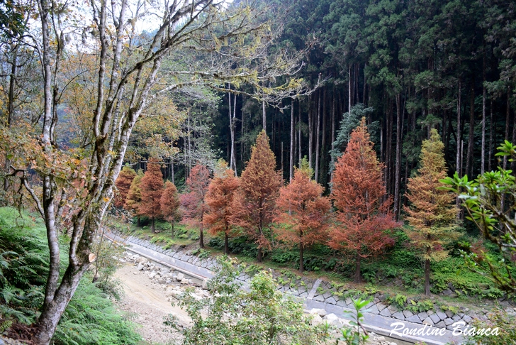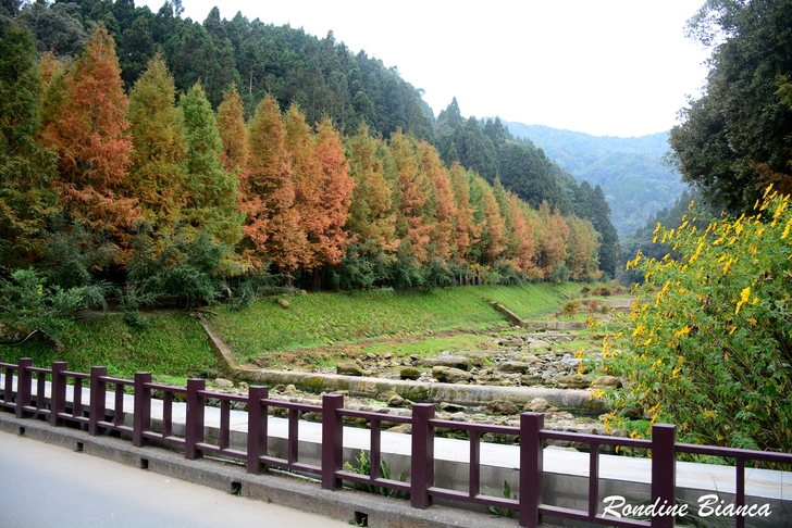 漫步林間,心折於這片杉林的華麗曼妙,想像陽光穿透枝葉,整片森林光彩奪目,「黃金水杉林」絕非浪得虛名。只可惜此刻是陰天,但即便如此,這座夢幻森林亦足以令人流連忘返! 離開水杉林,沿著溪畔道路漫步前往松瀧部落。溪谷彼岸的原始森林蓊鬱蒼翠,紅、黃楓葉點綴山林,落葉鋪滿溪畔,冬日的山林景緻,寧靜颯爽中帶著悠然詩意。