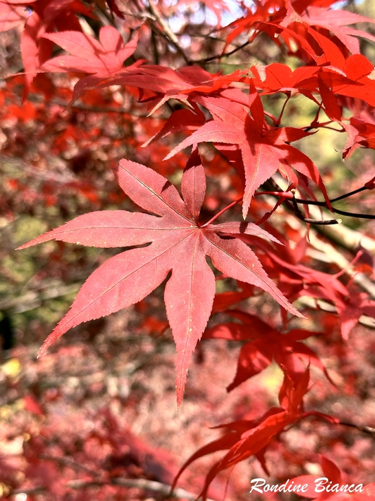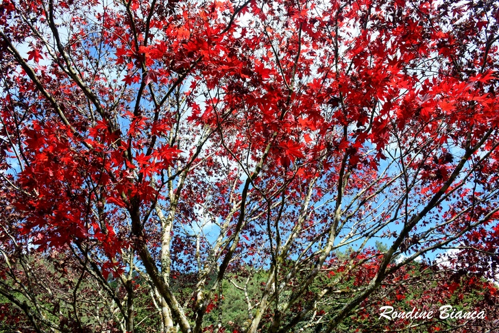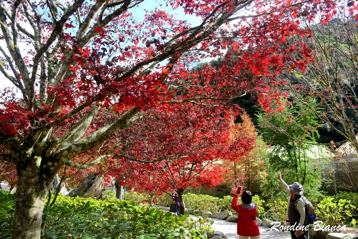 楓紅以燎原之姿錯落在蒼翠的山林之間,倒映在碧綠的湖水之中,而藍天白雲調和了懾人的豔紅,大自然的色彩和諧瑰麗得令人瞠目結舌!好友一時興起吟哦道:「藍天白雲襯楓紅,青山綠水映杏黃…」,對景當歌,不負詩情畫境!