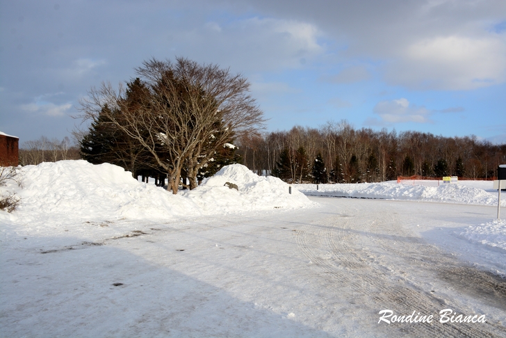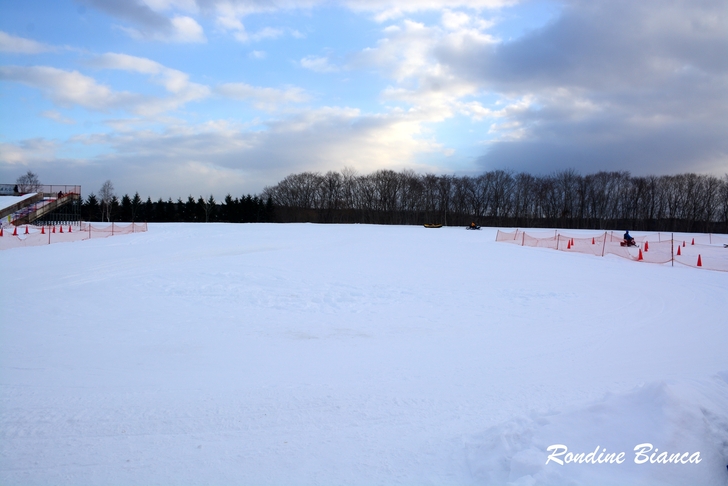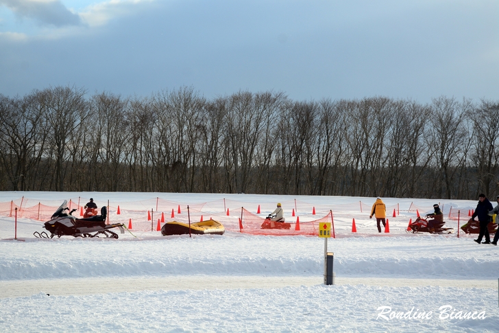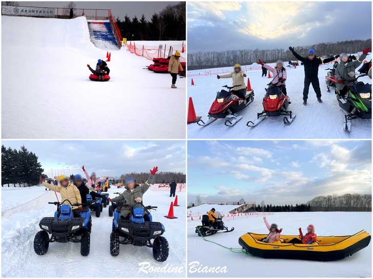 步出機場之前穿上所有禦寒裝備,上了遊覽車後頓時狼狽不堪!30 人的大團,只夠一人一個座位,車上暖氣開放悶熱難當,脫下的羽絨外套像一團棉被,加上隨身行李…真不知該如何安頓自己,說有多侷促就有多侷促!挫敗中自我安撫煩躁的情緒,為了追逐夢想的美景,忍受一些旅遊的不便是必要的! 千歲 北方雪上樂園 離開機場後直接來到「千歲北方雪上樂園」,這裡在夏季是一個高爾夫球場,到了冬季,則利用厚厚的積雪闢為雪上樂園。放眼望去大地一片雪白,只有樹葉落盡的樹林排列在遠方,大地只剩黑白兩個顏色。什麼叫「雪白」,原來如此這般! 從溫暖的台灣飛到寒冷的北海道,一下飛機立刻投身雪地遊樂活動,僵硬而笨拙的肢體似乎還跟不上節奏,看著那些遊樂設施本想作壁上觀,但同伴們躍躍欲試,於是冒著凍人低溫在雪地中玩將起來。 原以為雪地車拖曳滑行的雪上橡皮艇最是輕鬆簡單,殊不知快速旋轉滑行中倍感寒風刺骨,激起的雪沙打在臉上冰冷又刺痛,幸好只繞行一圈;而原先自認無法駕馭的雪上甜甜圈、四輪越野車、迷你摩托車等反倒是溫和許多。