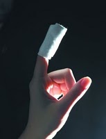 克莉絲已好一陣子沒因切東西將自己的手給切傷,前些日在公司要吃蘋果,以往所買蘋果都是較小顆配合克莉絲吃四方的大口,所以吃蘋果完全不需將其切成小塊故做優雅狀來食用,只是這次買的蘋果是大size那種(約小蘋果的2倍大),實在是很難以帥氣的態度啃食,才會用刀切成對半食用,若以為克莉絲平常因不下廚很少用刀才會切到手,這...就誤會大,其實克莉絲是每天都會操刀的女人(不是磨刀的瘋女…)因為晚餐克莉絲喝較多蔬果量都會打綜合果汁食用,每天都在切不同的水果放入果汁機中打汁,家中切水果刀還是有鋸齒狀很利的那一種刀說…重點就是在這…放在公司使用的刀是把”鈍”刀 ,切蘋果時刀就卡在蘋果心中難以自拔… ,為了讓蘋果與刀能分離,只好施大力,慘劇就發生…比蘋果皮還紅的鮮血在刀劃破手指後就如小湧泉般從傷口處源源湧出。(當下有股衝動想把流血傷口放入口中止血) 克莉絲並沒採取嗜血動作,只是用衛生指將傷口簡單環繞包起來,仍繼續啃食讓我受傷的蘋果(不吃掉這肇事者,心有不甘..)一邊吃蘋果,一邊辦公 ,還要一邊觀察傷口…. 白白的衛生紙慢慢被紅紅的血染透變色,克莉絲一直換衛生紙包紮不見止血,只好跟旁邊同事黛絲求救問是否有OK蹦或止血藥品,黛絲顯然是看到血就會心慌亂的女生,很快地幫克莉絲收集到醫療簡單藥品,克莉絲隨即將傷口塗滿小護士藥膏繼續用衛生紙包紮,黛絲很不安的問克莉絲流這麼多血會不會頭昏?(又不是動脈大出血 頭當然不昏) 會不會疼? 老實說傷口被切的剎那有點感覺被切到但沒有很痛。(之前克莉絲經過乳房X攝影的痛度震撼後,對痛的忍耐度的耐力有給它大大提升) ,克莉絲雄雄想唸書時護理有提到直接加壓止血法…上網Google一下如何止法: |
