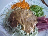 克莉絲雖廚藝不精,但對於自己愛吃的食物會像著魔般,找到相關食譜如做科學實驗般找時間DIY一下,之前網路還不是那麼發達時,食譜來源是看電視的教做菜的節目,邊看邊速記下來(非常克難…,要遇到正好煮自己愛的食物還得看機率,跟對統一發票一樣不好中.) ,現在網路資訊過多,任何菜色的食譜經過谷哥都能幫大家搞定,我們的選擇是要試那一家的食譜? 麻醬涼麵一直對克莉絲是感覺是輕食的食物,也是克莉絲數的出來會做的料理。但最近幾年來,國人對卡路里的注意日漸升高,一些食物被重新檢討,而在夏日許多人所愛的涼麵是許多營養師提出警告:容易不設防的危險食物,因為麻醬醬料的高熱量讓人吸收過多的卡路里不知不覺成為重量級人物。對於時時愛減重的克莉絲,對於涼麵的矛盾情懷是可想而知。喜嚐試料理實驗的克莉絲在打每日的果汁時 ( ps克莉絲每日除了會喝少量保健的山竹果汁外因其有些成份是可讓已在癌細胞難以存活可參考之前的文章” ,還會用新鮮水果打果汁,因為曾看過不少抗癌的書,癌細胞並不愛大量攝許蔬果類身體環境,去年完成治療後不代表一勞永疫(免除威脅),仍要注意飲食避免癌細胞會復發生長,所以癌症病患每隔幾個月就要去醫院做簡單癌症指數測試來了解癌症細胞在身體中被控制的狀況如何。) 每日為自己及娘製作新鮮果汁是克莉絲例行家事,果汁打久了對於果汁如何搭配會好喝,色澤會漂亮,克莉絲是很有心得的。 檸檬 半個 鳳梨 水 2 大匙 芝麻醬 1大匙 麻油 1/2 大匙 米酒 1 小匙 醬油膏1 小匙 蒜泥適量 紅糖適量或省略 步驟: 1 將檸檬及鳳梨及水2 大匙放在果汁機中打成果泥放在旁備用不需濾果渣 2 將芝麻醬及麻油, 米酒, 醬油膏 調勻 3 將檸檬鳳梨水果泥一大匙一大匙加入芝麻醬料中混勻嘗味道, 克莉絲加 4 大匙水果泥 4 最後加上蒜泥調出自己愛的蒜味 叮嚀: 1檸檬鳳梨水果泥打出來份量約有 8 大匙, 你若加5 大匙也很ok 2 以上醬料配方約一個人(大碗麵)的份量,圖片中克莉絲放1又 1/2 飯碗的麵for 兩人的午餐 3 調出的醬料因為檸檬是連果肉都取可能怕酸的人會覺的有一點檸檬苦味,克莉絲蠻能吃檸檬不會覺得苦但克莉絲的娘是不愛吃苦的人後來克莉絲酌量放些紅糖一小匙配合娘,下一次再試驗時克莉絲應該會將鳳梨的量再加多點打果泥,減低檸檬的苦味 4 調剩的果泥該如何處理? 就加一點水及冰塊當冷飲喝掉囉 醬料卡路里算看看: 檸檬 半個 : 約 20卡 鳳梨 水 2 大匙 芝麻醬 1大匙 : 100 卡 麻油 1/2 大匙: 約 66卡 米酒 1 小匙: 約 9 卡 醬油膏1 小匙: 約 5卡 蒜泥適量 以上醬料全部加起來約216卡,而傳統醬料而言麻醬至少用2 大匙(其他醬料還沒算就已200卡),有些配方還會加花生醬or 花生粉….熱量更高,克莉絲的水果口味麻醬醬料有水果的營養及清香也保留麻醬的濃純香,格友可能發現麵體及涼麵配菜的熱量怎麼沒計入?若想更低熱量可選蕎麥麵取代油麵蔬菜絲加量(選熱量低的麵體,克莉絲是用菠菜麵線 一碗半的麵約快400卡,加上醬料共差不多600 多卡,因為與娘分食所以一個人吃到300 多卡的熱量,算是輕卡的餐,與克莉絲一樣愛吃傳統涼麵的格友們,可動手試看看,此配方是克莉絲第一次試驗尚有改進空間,大家一起來切磋好吃又低卡的料理吧。