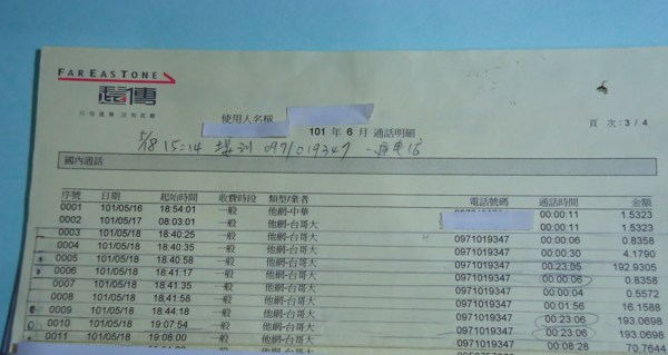 克莉絲收到上月 行動電話費,超過平常的很多,克莉絲並沒用手機上網的習慣更不喜歡用手機聊天算是手機羽量用戶,電話都維持基本費率,即使碰到教會辦活動會有較多聯絡,手機通話費也只是比平日基本費超支 多1-2 百元而已,這次帳單是平常的 3 倍多,百思不透的克莉絲乾脆向遠傳申請通話的細項,細項帳單收到後,真的是發覺帳單有奇怪的地方 : 有支完全不熟的電話為何會與克莉絲電話有熱線般連結 ? 怎會這樣 ? 克莉絲開始當起柯南將手機中接話的記錄一一查看是否有接過怪電話,果然看到來手機中有此號接話記錄,就在出現怪號碼與克莉絲手機熱線連接前幾個小時,怪號碼 : 0971019347 有call 進 克莉絲的手機中,而克莉絲應該也有接該電,但克莉沒有狂call過此碼手機..接下來就是格友看到的帳單明細 。只是事隔一個月誰會記住如電話行銷或打錯電話這種call 進克莉絲手機垃圾電話細節 ?? 看到帳單當下覺得手機線路一定應是被盜打 ! ?