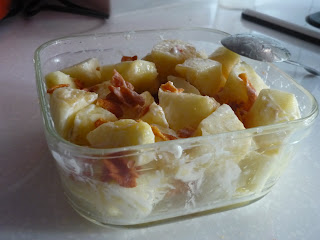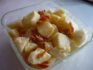 材料: 蘋果 原味優格 蠶豆酥(起司口味) 檸檬 1 個 鹽少許 步驟: 將蘋果去皮切塊後浸入鹽水中,可防止蘋果變黑: 若蘋果要放比較久才要食用就用鹽水泡 ,若是現做現吃完的人,蘋果就直接灑一些新鮮檸檬的汁在蘋果上對短暫防變黑也是有效果,加入原味優格 又到”卡卡計較一下下” 時間: 蘋果 原味優格 蠶豆酥(起司口味) 總熱量 310 卡(算是很少),吃完這一大盆也是很飽的…蠶豆酥看起來就是很不健康的食物,但此道創意料理,蠶豆酥只是小小配角增加口感的樂趣(就…別碎碎唸),不同口味蠶豆酥熱量不同哦,起司口味是熱量是最高的,喜歡”亂配”的格友可以嘗試原味或其它口味蠶豆酥來配蘋果。卡路里會少一些些。寫完這一篇有點小心虛…可能有些格友會os:吼..這…也算是料理? 其實這個這麼簡單的料理家中若有幼稚園或低年級的小朋友,應該也可以成為他們人生學料理中必勝料理食譜之一ㄛ。OL在公司也可輕易完成這道料理。 (總是要為自己難登大雅之堂的作品有個好說詞)