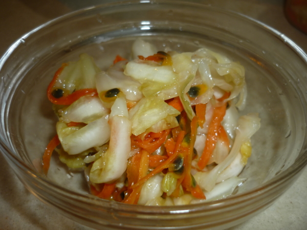 材料:高麗菜1kg (克莉絲家中高麗菜 約 紅蘿蔔1/4條 (克莉絲是用一條 約 200 g, 因為剩下 3/4條不知要做啥? 就全下鍋, 補高麗菜量的不足), 鹽1大匙, 柳橙1顆, 檸檬1顆, 百香果3顆, 鳳梨 味霖 黃砂糖 白醋 1.高麗菜洗淨用手直接撕小塊,紅蘿蔔刨絲
