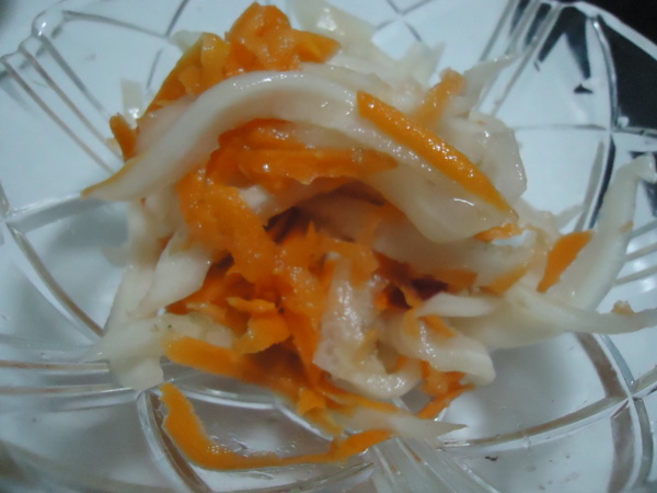 紅蘿蔔 白蘿蔔 鹽1/2t茶匙 糖 白醋 紅辣椒一條 步驟: 3.將鹽加入混合均勻 卡卡計較一下 : 紅蘿蔔 白蘿蔔 鹽1/2t茶匙 糖 水果醋50g: 11卡 蘿蔔