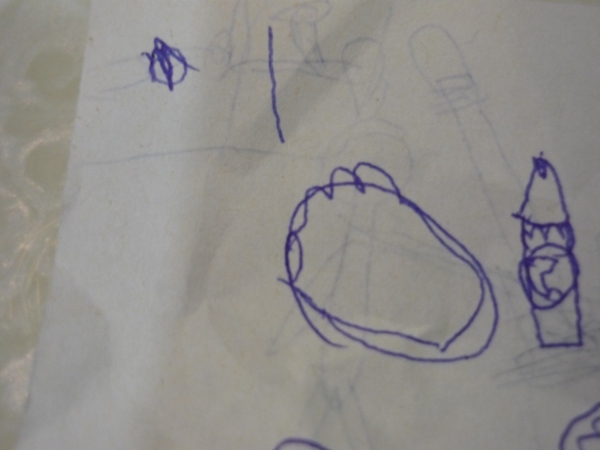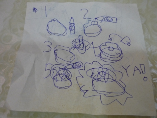 Cystal(水晶)是弟弟的小女兒,今年幼稚園大班,水晶小公主的褓姆-胖媽媽去年年中時因為發現腎臟部位長腫瘤需進醫院開刀及休養,褓姆得將手中所帶得小孩退回請家長自行另找褓姆,水晶雖都有上幼稚園但幼稚園下課得早,弟弟及弟媳下班時間晚無法及時接走小孩,所以請胖媽媽幫忙照顧水晶下課到晚上8:00 這段時間。對有學齡前小孩的雙薪父母,臨時找或更換褓姆真是惡夢一場。弟弟就動腦到目前已退休整天吃喝玩樂的阿娘。 阿娘早在十多年前時下達不會幫忙兒子或女兒帶孫子(外孫)的御令,姐姐及弟弟都很識趣的不敢麻煩阿娘帶小孩,阿娘會如此也不是沒原因,因為阿娘自己都沒帶過小孩,因為阿娘一直以來是職業婦女,所以幼秩園時克莉絲及手足都是阿娘僱來的不同阿巴桑來照顧,小學也選唸整天上課的私立小學,從小還要學會自己搭公車上下學,跟本沒人能接送妳上下課,阿娘阿爹工作地點一個遠在林口一個遠在泰山。上課的一些用品自己要機靈點記得帶否則被處罰自認倒楣,阿爹阿娘是沒法當孝子孝女的宅急便,從小我們都被锻練很自立自強,從不會想當靠父靠母族一切靠自己啦。臨時找不褓姆的弟弟也只好厚著臉皮請阿娘幫忙一星期兩天的課後看顧,其餘天則會安排水晶上幼稚園課後的才藝班可拖到快6:00pm,弟弟與弟媳輪流早點下班接小孩。無怪乎現代人越來越不想生小孩,這些看顧小孩的瑣事若不當全職媽媽真的是一個大麻煩ㄚ。 就這樣水晶小公主從以前每個月偶爾來克莉絲姑姑家吃飯探望奶奶,變成每週有兩天到克莉絲姑姑家報到活動。從來沒養過小孩的克莉絲,因為小公主的蒞臨有較多時間與小孩互動,生活中多一些童趣。水晶小公主是個偏食又不貪嘴零食的小孩,她的個性就是不太能嘗鮮,舉凡一切沒吃過的東西,她都不會好奇想吃看看。她對食物的基本反應總是搖頭拒絕,不像克莉絲姑姑從小就不懂得挑食,阿娘都覺得克莉絲好好養,隨便吃也能長得圓滾可愛。這也導致克莉絲姑姑長大後花很多力氣在減重這檔事。.老實說克莉絲姑姑還蠻羨慕水晶小公主從小就懂跟食物說:”不”的哲學所以沒有圓滾滾的身材。所以好身材的女生不需要每天狂踩飛輪耗熱量維持美好體態,只要從小就學會常對食物搖頭習慣就不會胖滴。對長輩而言水晶小公主這挑食行徑常常惹惱奶奶(即克莉絲的娘) ,阿娘的廚藝算是不優的,現在每周兩天水晶小公主會到家中吃晚餐,阿娘殫精竭力想破腦的煮了一桌菜給水晶小公主,並想改掉她偏食的習慣。沒想到很有種但白目的小公主居然跟奶奶說: 妳煮的沒有一道菜我想吃的耶…. ,水晶小公主的剛來的前幾個月,阿娘的頭很大不知要煮啥? 很少有人敢直接批評阿娘的廚藝。克莉絲的手足們即便吃到阿娘煮得不好吃的菜,也不會大辣辣上諫言,都拐彎抹角提醒或很有默契的吃很少讓食物成為垃圾車的廚餘餵豬。阿娘的廚藝是很難取悅小公主,阿娘無計可施只好警告她的兒子(即克莉絲的弟弟) ,如果水晶公主再這麼挑食難帶,請自己帶回去想辦法。當然水晶小公主回家慘遭她阿爸大大的修理並警告: 下次到奶奶家再挑食,回家會被處罰。現在阿娘要孫女乖乖吃飯的秘密武器就是恫嚇她: 我現在要打電話給妳爸爸告狀…。 克莉絲姑姑每次被看到被阿娘恐嚇的小公主,吃飯時發出歎氣的無奈的畫面也覺得好笑。老實說水晶也不會太難養,因為她喜歡的食物十根手指頭數的出來很固定的。克莉絲姑姑只有力勸阿娘,不用企圖改變水晶小公主的飲食習慣,不如提供她愛吃的食物! 現在阿娘就直接問水晶小公主妳本週想吃什麼 ? 水晶小公主真的會認真想及回答,她的回答非常的中肯,例如:玉米湯及 “白”老闆家的水餃10 顆(小妮子從小對某些東西就有高的品牌忠誠度的情操. 白老闆是克莉絲家附近某麵店有賣水餃),若依照小公主要求的準備晚餐。小公主吃飯時間不會拖拉1-2個小時,很快就能完成。 前幾天在客廳桌上看到水晶小公主的很有意思塗鴉紙片,問阿娘怎麼一回事? 阿娘笑說水晶小公主今天教她煮蕃茄蛋包飯`。(好塞雷!直接指導奶奶如何煮飯??) 因為當晚阿娘問水晶小公主想吃什麼? 水晶小公主說她想吃蛋包飯,阿娘回答小公主: 奶奶沒做過這道料理-不會做ㄛ!。沒想到愛畫畫的小公主認真得對阿娘說:奶奶我教妳。於是水晶小公主用自己能表現塗鴉的方式畫出這道食譜烹飪的程序與方式。經過小妮子的解說,發現水晶小公主算是畫得很有邏輯,對家中不開伙煮飯的弟媳,克莉絲驚訝水晶小公主可以這樣有條理敘述煮蛋包飯的處理過程,水晶小公主真是克莉絲姑姑心中幼兒界的傅培梅。克莉絲姑姑真得要給妳一個大大的”讚”