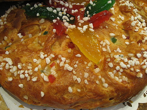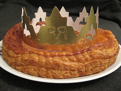 每年聖誕節一過, 糕點舖的櫥窗內開始有各種多種口味不同尺寸的國王烤餅(上圖)陳列上架, 彷彿提醒著大家一年一度的主顯節即將到來, 在法國這個以信仰天主教為主、上教堂禮拜人數卻越來越少的國家, 宗教節慶漸漸演變成民俗甚至是商業活動, 品嚐國王烤餅除了有一份歷史源由的考量外, 更多的是一份家人朋友相聚歡慶的熱絡, 因此主顯節究竟是在一月六日或是聖誕節過後第一個星期日的爭議也就沒有那麼重要。 爸爸小時曾受洗為天主教徒, 在長達十餘年福音的洗禮下, 縱使後來轉宗皈依為佛教徒, 但對於天主教的教義及節慶仍有些迷迷糊糊的認識. 主顯節是繼聖誕節之後的一個重要日子, 指天主顯現給世人。 耶穌降生時, 曾藉異星顯現給東方國王賢士, 教會舉行主顯節藉以紀念耶穌首次與非猶太人接觸。 而傳說國王烤餅的誕生, 正是由於三個國王前往伯利恆探視耶穌, 攜帶了一種烤餅, 為耶穌祈福與許願。 在古老的從前, 主顯節甚至遠要比聖誕節來的重要. 分享國王烤餅推測自十四世紀起便已盛行. 時至今日, 與親友們共同品嚐國王烤餅成為紀念主顯節的重要儀式之一, 這其中除了美味共享所帶來的祝願外, 還有就是一項大家期待的遊戲—選國王, 就是為公平起見由參與的其中一人(通常是年紀最輕者)躲在桌下, 隨機指定國王烤餅的分配, 烤餅中有一小瓷偶(下圖一), 或為人像、或為各種小物品, 吃到該瓷偶之人便為當天之國王, 進行頭戴皇冠(上圖)的加冕儀式, 法文中甚至出現fabophilie一字專門指稱小瓷偶收集迷, 據說第一個小瓷偶可是由德國人於1874年所發明製造, 在此之前, 國王烤餅內放置的可是一粒小蠶豆, 其功能就如同選票, 利於遊戲中國王的挑選。 在法國, 每年熱鬧的聖誕假期一直要到隔年年初的主顯節過後才算正式結束。 今年家中首度品嚐的國王酥餅為杏仁奶油餡口味, 一般的國王烤餅除了在外型餅皮方面可分為千層派皮及麵包皮, 巴黎地區多以前者為多, 而後者多半在法國南部才品嚐得到; 在內餡選料方面也是多所變化, 我們所品嚐的杏仁奶油餡就是最傳統的口味, 其它還有巧克力、葡萄乾及糖漬水果(下圖二)等多種口味. 至於今年度新出爐的小國王正是Stephane, 其實我們在切餅之前就已預知這樣的結果, 因為他早已警告我們他今年非作國王不可, 否則…………………………………….. 那爸爸當然只好不動聲色的想方設法, 只有Maribel被蒙在鼓裡, 不過Maribel也說了, 為了公平, 下次輪到她做國王, 哈哈, 看樣子我們的新年假期將在吃餅中度過.