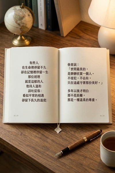 有一次他來拜訪時 忽然說了一句讓我至今記得的話 他說:「世間什麼最美?靜靜地欣賞一個人 不侵犯、不佔有,保持一點距離 那種美感,是我心情最愉悅的時刻。」 當時我沒有完全理解他在說什麼,只是靜靜聽著 他看得出來我似懂非懂,於是微笑著說: 「妳是我非常欣賞的人;我會動心 但不會任意越線,這是原則。」