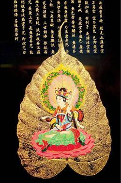 台北縣新店市立圖書館展出難得一見的金菩提葉佛菩薩畫像,佛像繪畫名家覺妙玄明居士以來自印度的成道菩提樹葉,利用真空鍍金的方式,製成金菩提葉,再以七種寶石磨粉製成漆料作畫,繪製三十二種菩薩法相,相當莊嚴殊勝。 覺妙玄明居士追隨悟覺妙天禪師修持印心佛法十五年,精通油畫、國畫與金菩提葉佛像,尤擅觀音法相,他所畫的每尊觀音不但造型婉約、尊貴莊嚴,更充滿了生命力。 本次在新店市立圖書館展出島內少見的金菩提葉佛菩薩畫像,作畫使用的菩提葉皆取自釋迦摩尼佛當年在印度成道的菩提樹,覺妙玄明居士說,菩提葉畫像緣起于古印度,由於菩提葉取得困難,加上要在薄如蟬翼的葉子上作畫困難度高,自古以來大多由佛寺珍藏,一般人較少有機會親眼目睹。 覺妙玄明居士四年前曾看過大陸畫師在乾燥的菩提葉上作畫,他加以技術改良,為了呈現菩薩莊嚴的法相,利用真空鍍金的方式,製作成金菩提葉,並且在漆料中,加入七種寶石元素,讓作品色澤明亮,也大大延長了畫作的保存期限。 金菩提葉佛菩薩畫像即日起在新店市立圖書館展出至二十二日,策展單位同時舉辦兩場“禪的饗宴”專題講座,十五日下午兩點“開運禪”講座,主講人宗陽老師,十六日下午兩點“企業禪”講座,由王蓮老師主講。 自由時報