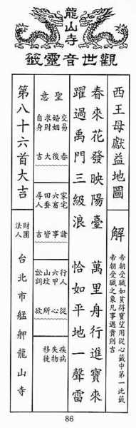 印行流通序 釋印光撰 觀世音菩薩,愍念眾生之心,不可以言語形容。雖天地父母,未足以喻其少分。善根未種、未熟、未脫者,令其即種、即熟、即脫;應以何身得度者,即現何身而為說法。喻如日麗堯天,萬象咸蒙照燭;春回禹甸,百卉悉荷生成。有感即通,無謀而應。良以菩薩無心,以眾生之心為心,故得遍法界感、遍法界應,悉副彼念,了無差殊也。 ﹝觀音感應課﹞者,俯順世情,令卜休咎,以期同種善根之妙方便也。凡占者,皆須稱菩薩名。如小兒有病,不肯服藥;塗藥於乳,則不服而服矣。菩薩名號如還魂香,若得見聞,宿業自消、宿善自生;以漸至于上追觀音之志事,究竟自利、利他於無既也。 茲因徐積餘居士與其夫人,得前明古本,石印千卷以結淨緣,略敘菩薩行慈之意云。 印光大師法語 觀世音菩薩,愍念眾生,尋聲救苦。凡作善事,懇求菩薩,必垂加被,令其得成。若作惡事,亦垂加被,令決不成。以成則造罪墮苦,其苦難救矣。此菩薩之真慈大悲也。 欲決疑者,若原供有菩薩像,則於像前焚香禮拜;若無,則即向此課本焚香禮拜。取五淨錢,將香煙上熏過,心中默禱所問之事,按下列之偈,並念菩薩若干聲。將錢在手中搖幾搖,令其次序散亂,然後擲於桌上;按次是幾字幾幕,照課本查是何卦,即得其所示之兆云。” 【編者按】:五淨錢者,即取五枚銅幣,各於其ㄧ面,分別寫上「金、木、水、火、土」,平時宜收妥,專作占課之用。 占卜法須知 昔日唐三藏詣西天取經,值觀世音菩薩曰:汝往西天求教,道途凶惡,緣汝能辨。吾助汝三十二感應靈通之卦,日傳ㄧ課,便見當日前途吉凶,禍福無不應者。 欲叩,焚香祝禱,用淨錢五文,於香煙上度過,手內擎搖。禱祝偈曰: 紫金化身千百億 白衣妙相三十二 稽首圓通自在尊 沙界咸稱大悲主 南無大慈大悲靈感觀世音菩薩摩訶薩 志心念七遍,或三七遍,或一百八遍。叩而念,願賜證明。今虔祈禱;弟子某某,所求某事,未絕憂疑;卽於三十二課內,欲占一課。勿順人情,願垂感應﹗ 流通製版緣起 昔明宮后,每齋沐焚香,捧誦 《觀世音菩薩靈課》,時為社稷卜歲豐、祈太平,屢屢感應;遂命付梓,印施百卷,以便臣民決疑,令預趨吉避凶。明明法寶,慈澤後人。意願宮闈清古,海宇昇平;雨露均調,仁風休作。願我 菩薩靈課,啟發愚蒙,格佑為善。苟瀆慢而不敬者,占之反至尤焉。時萬曆壬辰正月十五日,刻於大乘禪寺,計板二十二塊,請京都衍法寺流行天下。 民國二十年間,徐積餘居士得前明古本,印施千卷。三十五年七月,比丘尼隆志,得徐本相示,為其手錄并改良圖畫,獻之蘇州靈巖山寺妙真方丈,請求製版流通,兼作靈岩山觀音洞籤書之用。爰作讚偈曰: 靈巖觀音洞 妙相親身化 圖成垂觀瞻 白毫悲心挂 諸惡不可作 眾善時加護 心念不空過 能滅諸有苦 (無錫弟子王德超敬撰) 圖例