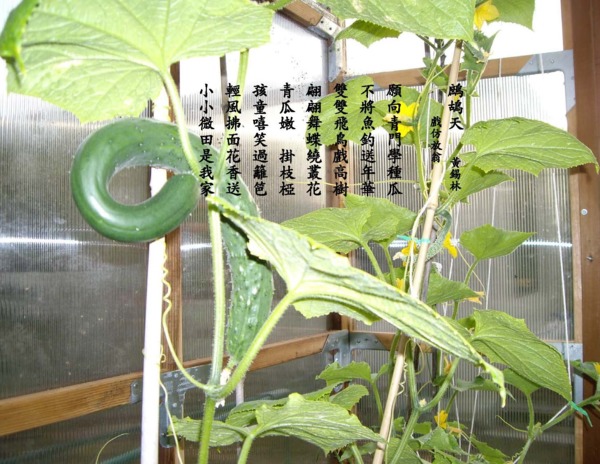 願向青門學種瓜,不將漁釣送年華。雙雙飛鳥戲高樹,翩翩舞蝶繞叢花。 青瓜嫩,掛枝椏,孩童嘻笑過籬笆。輕風拂面花香送,小小微田是我家。
