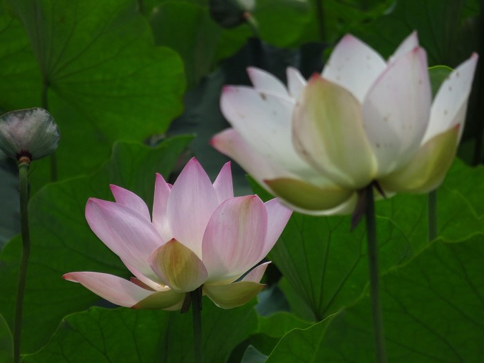 大約早上9:30,光影還有點斜、有點疲弱,花瓣葉影間的影子交疊,保留清早荷花清新身段