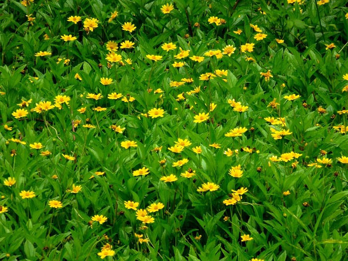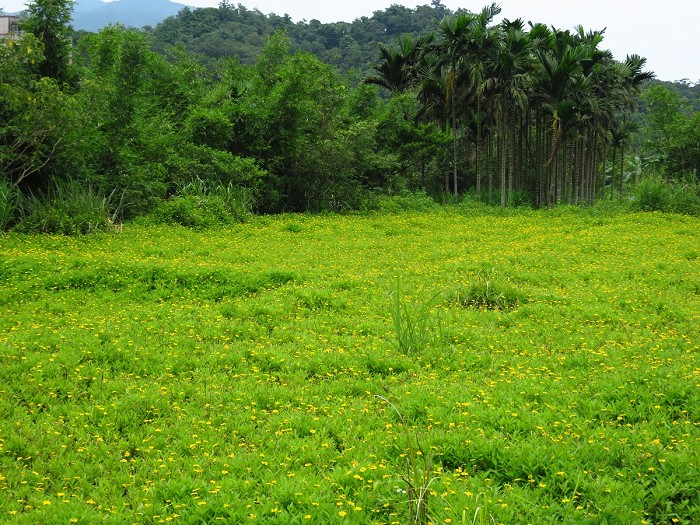 站在小田埂上賞花,後面佇著一根根筆直的檳榔身子 靠山很整齊也很安靜,影中的靠山很沉穩,花看起來很幸福