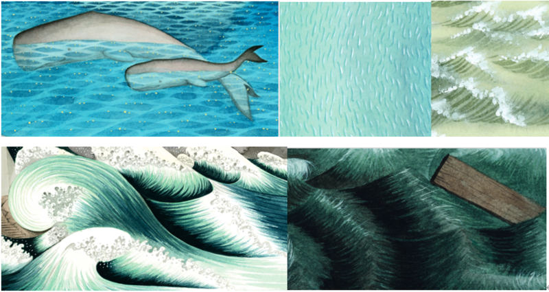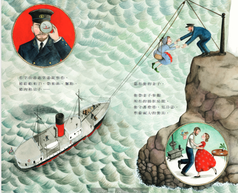 這本《燈塔你好》,是蘇菲‧布雷克爾在近幾年內第二度囊括凱迪特獎金牌的傑作,我很喜歡她在許多畫面上的布局與描繪,例如重複出現的圓形圖像,呼應了燈塔的圓形房間;用航海繩索框住的小插圖,讓人有如透過望眼鏡窺探到塔裡的一舉一動,也拉近了我們與看守員之間的距離;一長排由上而下的螺旋梯,隱約可見燈塔看守員妻子忙碌、奔跑的身影,彷彿聽得見她急促的喘息聲。還有還有,那每一頁都變化莫測的海平面,有時微微泛著漣漪,有時隨風颳起小浪,有時則是掀起像日本浮世繪裡那樣的滔天巨浪。各式各樣的浪無時無刻拍打著礁石,益發襯托燈塔的屹立不搖和看守員的堅守岡位。