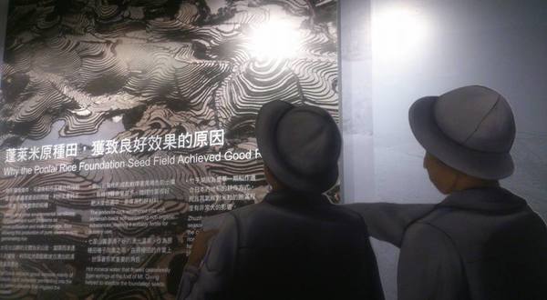 裡面說著磯永吉研究蓬萊米的過程,也說了竹仔湖的前世今生。以前種稻,後來種菜再來種花卉,導致今天竹仔湖種海芋聲名大噪。 進去時,招牌的英文被同學發現有錯,於是裡面的值班職員接受糾正。工作人員很謙虛,頻頻點頭,承認不對。 後由最裡面參觀到最外面,問鎮館之寶是什麼?同學問,他們遲疑一下,說是天花板上垂掛而下的稻稈。後來我們覺得是最大棵的假櫻花樹,最好玩,在那拍照,可以得到好作品。
