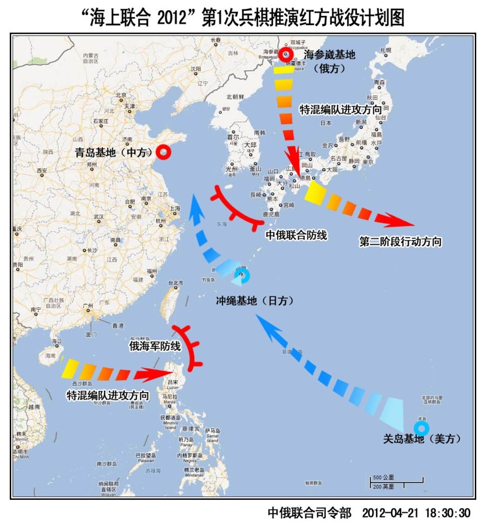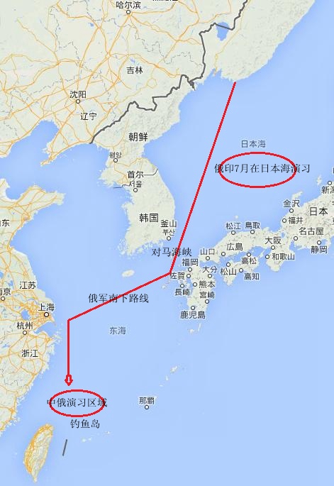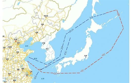 藍線:中國海軍艦艇編隊出海參加中俄“海上聯合—2013”軍演,演習後,兩艘艦艇撤回歸建,另5艘艦艇于14日通過宗谷海峽;紅線:5艘艦艇經西太平洋返回母港,並在返航途中于西太平洋海域進行遠航訓練。