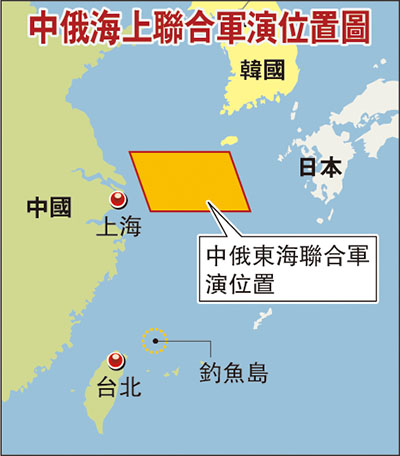 由於大陸與俄羅斯將於5月下旬在東海舉行聯合軍演,大陸海事局這份10日起放在官網的公告,格外引人矚目。 根據公告,屆時東海管制的水域包括:長江口12.5公尺深水航道、黃浦江部份航段、長江口2號錨地、吳淞江口錨地5#到6#錨區,及東海某特定海域。 這份公告宣布,在管制期間,要求無關船舶不得進入管制水域,不得在管制水域航行、停泊、作業;管制水域內對江輪渡,在開航前應向現場海事巡邏艇報告,經許可後方可開航、穿越航道。 公告說,具體管制時間與範圍,由上海海事局航行警告和上海海事局安全資訊廣播VHF 20頻道每整點發布,有關船舶應聽從主管機關船舶往來航行服務(VTS)和現場巡邏艇指揮。 中共解放軍報日前引述共軍權威部門的消息說,大陸與俄羅斯海軍將按照計畫於5月下旬在上海附近的東海海空域,舉行「海上聯合2014」聯合軍事演習。 俄羅斯海軍代表告訴「俄羅斯之聲」,中俄海軍將進行演習地區偵察,明確雙方海軍聯合行動計畫,以及防空、反潛、封鎖、航渡、補給等科目聯勤。 由於美國總統歐巴馬日前訪問日本時,首次公開談到釣魚台納入美日安保條約範圍,引起大陸強烈抗議;而俄羅斯則不滿美國對克里米亞半島和烏克蘭局勢的態度。專家分析,中俄這次在鄰近主權爭端島嶼附近海域舉行聯合軍演,有意在和美日同盟較勁。 中俄响应马英九东海和平倡议,以实际行动维护东海和平。