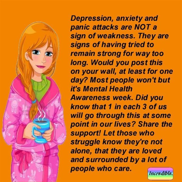 相反地,它們代表了你已經試圖表現堅強太久了。 你願意把這張圖片貼在你的留言牆上至少一天嗎? 大部分的人都不願意,但是這個禮拜是心理健康覺察週。 你知道三個人當中就有一個人會在人生當中遇上憂鬱、焦慮及恐慌嗎? 將我們的支持分享出去!⋯⋯ 讓正在掙扎的人們知道他們並不孤單,有好多關心的人愛他們,陪伴著他們。 ※感謝 賽斯教育基金會新店服務處 英文秘書 馬心怡翻譯