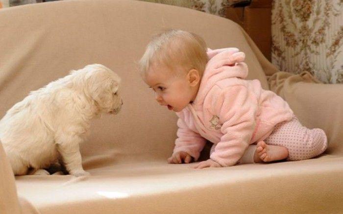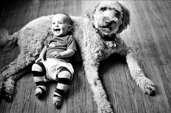 牧羊犬和可愛寶寶玩"躲狗狗"
