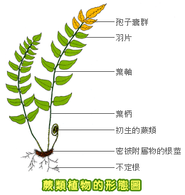 找不到第二種植物像蕨類一樣,那麼像飛鳥的羽毛;每一株蕨如一支活的羽毛化石,精密地記載地球的遠古歷史,也繪出它們的飛航地圖。在台灣,似乎也找不到第二種植物,像蕨類擁有淒迷的身世,忽視它的人視作野草,熱愛它的卻樂於踏遍陰暗、潮濕角落,採擷一則則美麗傳奇。 全世界的蕨類約12000種,日本產約500種,美、加地區則僅350種,唯獨彈丸之地的台灣多達600多種,以總密度而言,台灣確是「蕨類王國」,當之無愧,更難能可貴的是,這些蕨類絕大部分都是道地本土植物,其中尚有60多種屬於台灣特有,彌足珍貴。 台灣得天獨厚是蕨類天堂,可惜一般人對極具台灣味的蕨類植物卻認識不多,甚至尚停留在能吃、不能吃的口腔期分類法。 蕨類的基本構造 根:蕨類的根一般都是細絲狀。 莖:蕨類的莖有像筆筒樹的長直立莖、有在地面上匍伏生長的橫走莖、與較短的直立莖。 葉:葉可是蕨類最富變化的器官,繁複的羽狀葉片是很多人學生時代裡的回憶,蕨類的葉子還有一個最特別的地方,在新葉長出時的由內往外擴張捲曲樣子,有的甚至像是一個問號的符號。 毛:常見於蕨類植物的葉柄基部,微小的毛可是有很多種形狀,可以拿來作分類的特徵。 鱗片:跟毛一樣,也是附屬的構造,不過毛是單細胞,鱗片是多細胞。 孢子:較低等植物的繁殖構造,由一棵孢子就可以發芽生長。 孢子囊:蕨類的孢子好幾棵孢子長在一起,常常外面還有一層膜包起來,這樣就稱為孢子囊。 孢子囊群:如果一群孢子囊集中在一起,有時外頭還有一層膜包起來,這種情形就叫稱為孢子囊群。 原葉體:孢子發芽後長出來的心型貼地的小葉子,上面有精子跟卵,卵授精後便可長出新的蕨類。 蕨類的特徵 :