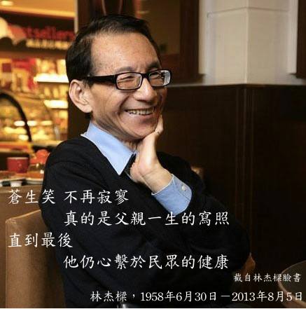 從一個治療腎病病人的醫師,看到黑心食品、毒物對人體的傷害,轉變為教人預防傷害的毒物權威,林杰樑不管在私底下或是螢光幕前,總是不厭其煩呼籲大家要「清淡飲食」、「生鮮當令」,不要迷信健康食品或有機飲食,如今毒物權威倒下,就像林杰樑家人在臉書留言:「我的家庭需要他這個好父親,我們的社會需要他這個良心」,令人婉惜。