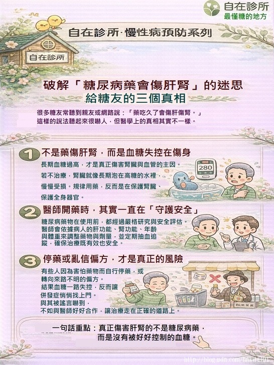 很多糖友常聽到親友或網路說:「藥吃久了會傷肝傷腎。」 ① 不是藥傷肝腎,而是血糖失控在傷身 ② 醫師開藥時,其實一直在「守護安全」 ③ 停藥或亂信偏方,才是真正的風險 一句話重點: |