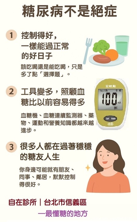 很多人一聽到糖尿病,第一反應是「完了」。其實,糖尿病真的不是絕症,反而更像是一位需要你多花點心思相處的室友。以下三件事,讓你換個角度看它: 1 控制得好,一樣能過日常的好日子 2 工具變多,照顧自己比以前容易得多 3 很多人都在過著穩穩的糖友人生 糖尿病不是句號,而是提醒你「從今天開始,多對自己好一點」。只要照顧得宜,你的人生依舊可以活得很亮、很順、很有味道。 |