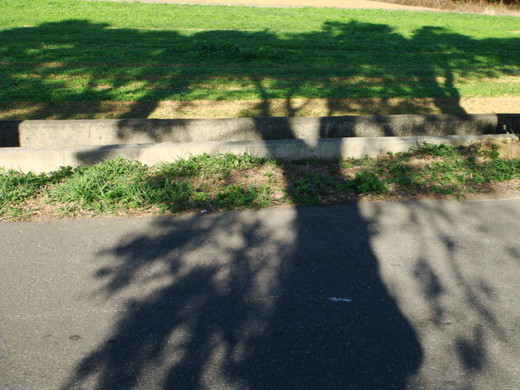 這是一棵樹的影子越過了馬路到達對面的田野。