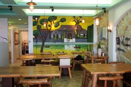 伍参港海廚餐廳就在真情非凡行館一樓,原就是真情的咖啡館,改造成餐廳以後,裝潢風格融入更多在地元素,不同於以往的地中海風。「伍参港」餐廳的Logo,乍看是一條寫著53的大魚,趨近細看,你會發現,大魚當中藏著兩條小魚,加上頭城沿線有五座漁港。這Logo圖案,出自吳世聰在國外學設計的兒子手筆。