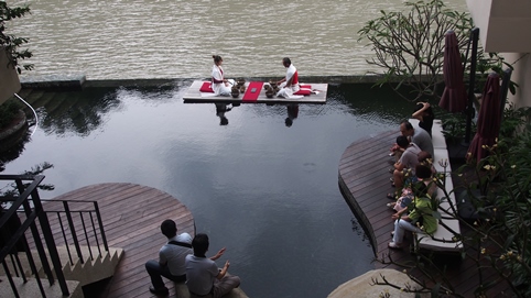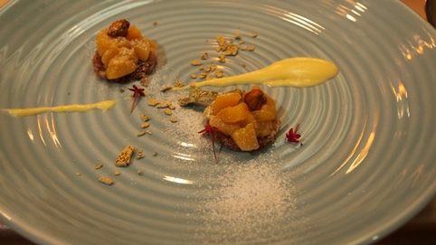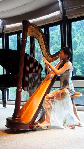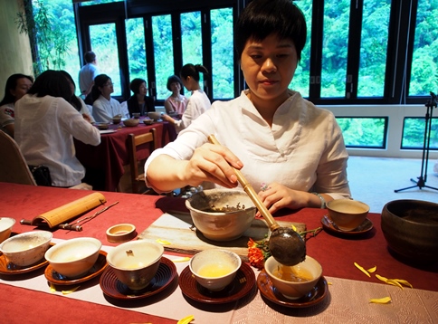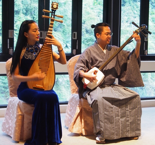 9/15日台灣正受山竹外圍環流影響,烏來飄起間歇風雨,此時旅店推出玲瓏弦韻—米其林二星茶宴,重現唐宋時的茶碗泡茶(品賞紅香烏龍和東方美人茶兩款茶品),並搭配樊家瑋的琵琶與鍾於叡的三味線演奏,為這場茶宴演繹溫馨浪漫的音樂賞茶會。