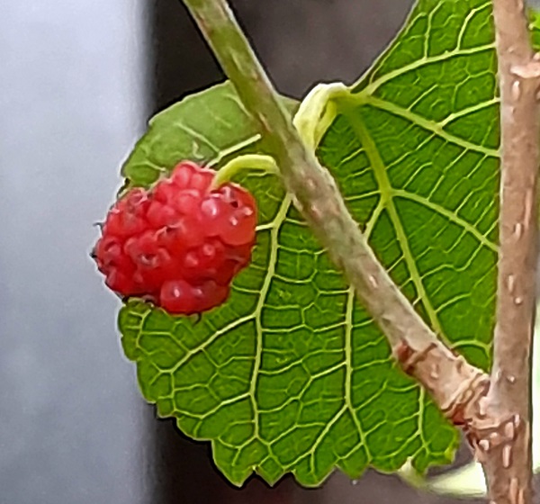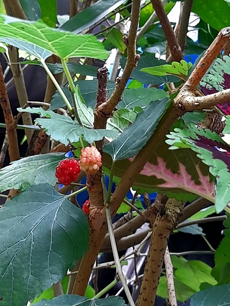 南部是台灣桑葚主要產地,幾年前春末夏初走訪小琉球,當地民宿端來的迎賓飲料竟是清涼酸甜的桑葚汁,讓我驚艷之餘興起種桑葚的念頭。幾年過去沒想到因市場偶遇桑葚果農終於有機會實現種植夢想。 兩年前在市場偶見桑葚小販並選購一小籃框,除了當天清洗現吃,便依桑農建議自製桑葚醬以便保存。清洗後的水留有桑葚殘果倒入花盆,一段時間後竟長出好幾株桑樹苗,便在陽台以花盆種起果桑,或許是植株小營養不足,今年結出的桑葚極小 有如野外無人照料的野桑,心想終於有機會品嚐自栽的桑葚,沒想沒等轉黑成熟竟全進了飛過的小鳥肚裡,至今仍無緣一嚐自家桑葚滋味。 |