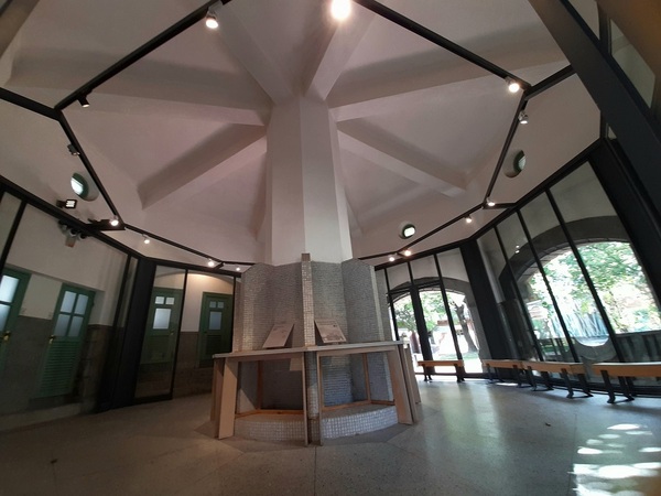 細賞優美的鐵道部廳舍主建築,設計上其實不對稱,此乃因建築非一次完成,1918年首期完工大部分建物和兩座搭樓,當時經費充裕做工繁複細膩,到第二期施工時因為銀兩不足,建築外牆的設計顯得簡單許多,從內側庭園區比較兩側建築便能發現端倪。 走進鐵道部優美的庭園,遊人可見中央有座造型獨特的八角樓建築。很難想像這棟建於1919年的磚造建築,竟是棟頗前衛的開放式男廁。因當年鐵道部員工多為男性,園區只建男廁便不奇怪了。八角樓屋頂砌石板瓦,主結構為鋼筋混凝土中空八角柱,上有通風口,外牆以八根鋼筋混凝土樑連接,有如一把撐開的巨傘,八角柱周圍設計八個小便斗(有門的便所設於兩邊共四間)。便所後方配置戶外化糞池,外牆則以洗石子和牆面分割線來表現古典風格。