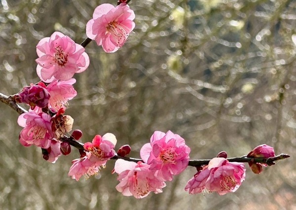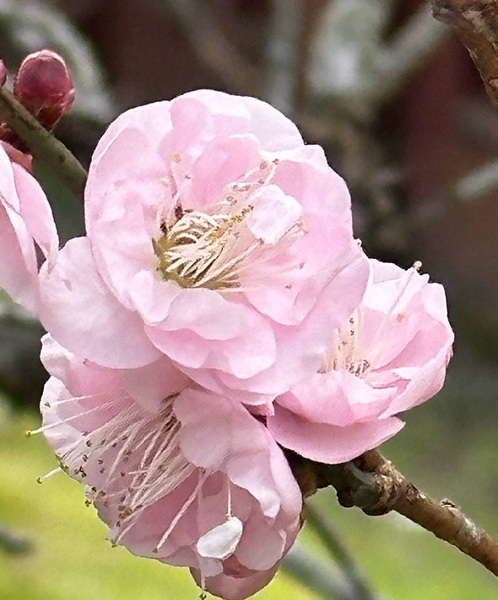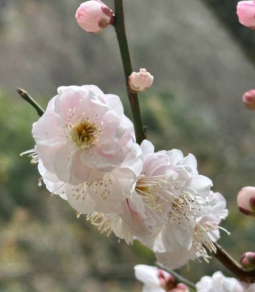 武陵農場以種植純觀賞的花梅為主,花色有白、粉和紅,梅園就在農場辦公室前方草坪區,繽紛梅景與青綠的巨樹相互輝映,成為冬日最美的梅景。花梅花期略晚於食用梅,元月中旬到二月間開花,接續便由武陵最知名的紅粉佳人櫻花接棒綻放。現園內已見部分紅粉佳人招展。