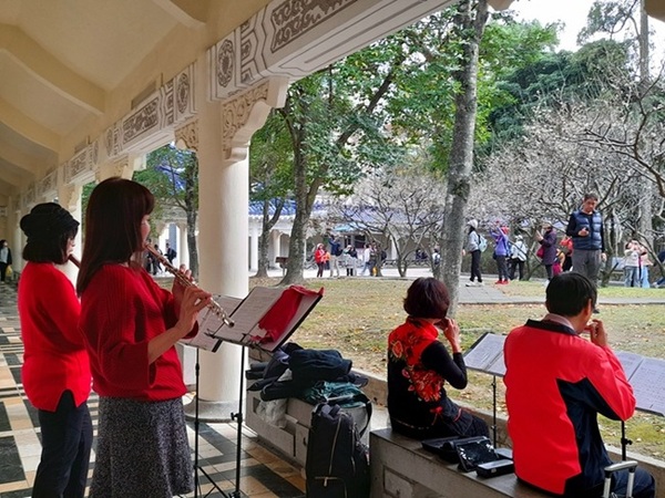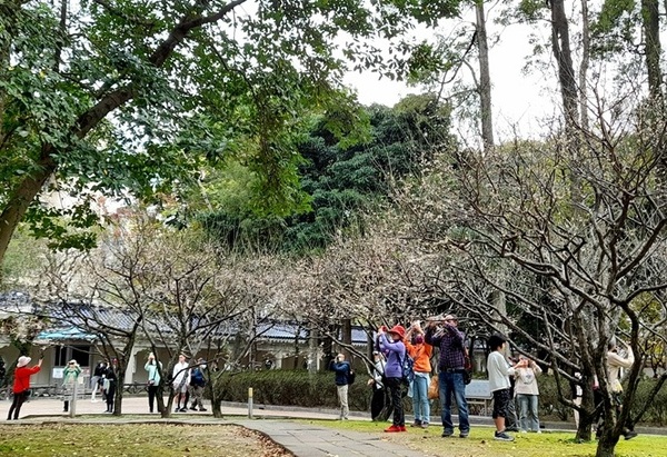 最早綻放的食用梅花,現已進入盛花期,中正紀念堂在信義路和杭州南路一角的食用梅園,梅開眼笑吸引不少賞花遊人獵影聞香而來。相距不遠的花梅(宮粉梅)只見零星開花,反倒是大忠門附近的山櫻花已見艷艷招展。