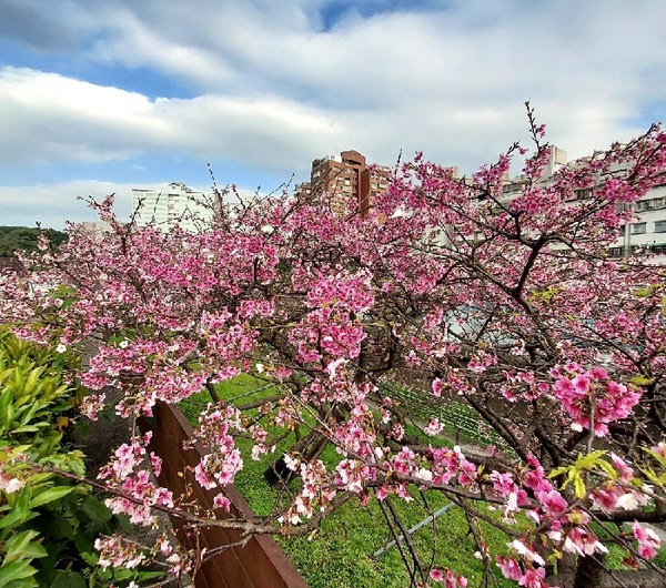 圖說﹕內溝溪櫻花盛綻。Sanny/攝影 內湖樂活公園沿著內溝溪種植櫻花多年,早已在大台北打出賞櫻名號。樂活的櫻花分為兩波先後綻放,目前(二月上中旬)盛開的是寒櫻,該品種櫻花為雜交種,花期與寶島最先開花的台灣山櫻相仿,台北東區的花旗廣場和刑事警察局大門前均有栽種,只是櫻景規模較小。