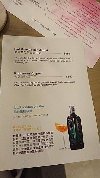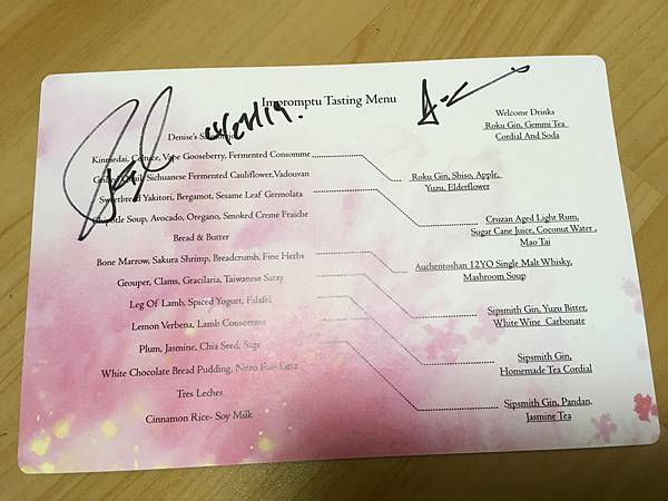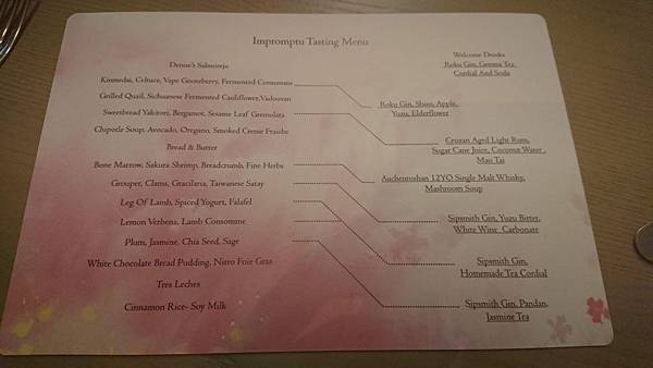 雖然說是無菜單料理, 但是不會真的讓你毫無頭緒, 菜單這不就來了嗎~ 據說就是當日限定,明天可能就不是這些菜色了呢, 印刷很漂亮,每人一分,是有厚度的紙張 翻過來看看⋯咳咳⋯ 全英文(偷偷拿手機出來查) 菜單左邊是吃的, 一道一道菜,沿著虛線連過去是搭配的雞尾酒。 . 沒錯!隨著菜色一一上桌,也有特別調製搭配的酒精飲料, 數一數共七杯啊! 平常一杯倒的雪咖啡,能不能撐到最後呢? 讓我們繼續看下去⋯ . 雪咖啡也喜歡他們的菜單, 不做作,也不故弄玄虛, 不會取一堆猜不透出什麼菜的飄渺菜名; 菜單上直截了當告訴你,我們要吃什麼, 譬如可以看到櫻花蝦、布丁、羊腿、麵包⋯