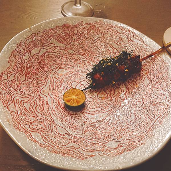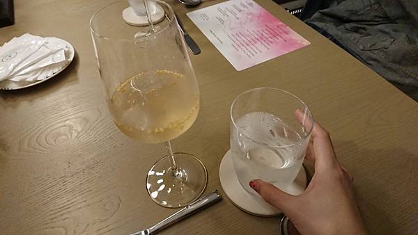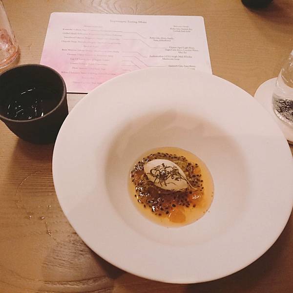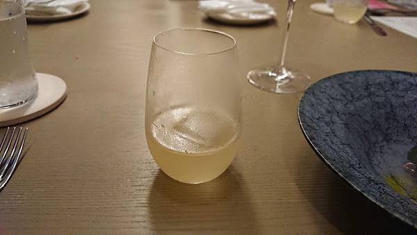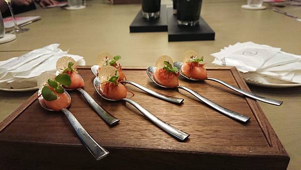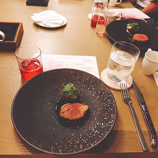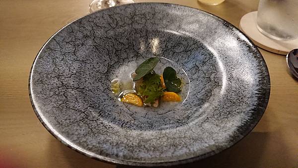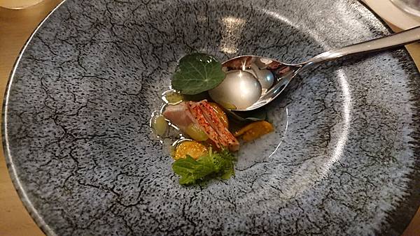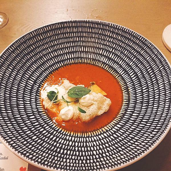 左邊的是迎賓酒, 用一支名字叫做「六」的日本琴酒為基底,搭配蘇打水和玄米茶, 很特別吧!看到杯子裡一顆顆的,就是脆脆硬硬的玄米茶。 . 很舒爽不負擔的味道,玄米本身能去油膩和厚重感,所以就算搭配上琴酒, 也不會有太重的酒精感,很輕盈的感覺,容易一口接一口, 本來預計只要嚐個味道就推給老公的雪咖啡, (因為我還要留扣打喝後面啊) 還是幾乎喝掉大半杯了, 然後才上第一杯,我就感受到酒精的力量了⋯哈哈 . 右邊我們配的是有海鹽味道的氣泡水, 我拍照片是為了那個中間還凹陷的玻璃杯, 因為滿別緻的,而且這樣很好拿,比較不會滑落。 前菜是番茄冰沙,一人一湯匙啦, 上面搭配餅乾之類的, 番茄味滿重的,冰冰涼涼 . 上菜的時候主廚還會特別拿麥克風幫大家介紹菜色, 所以是整餐廳同步的喔, 他一個晚上就做這麼一餐, 沒有管他什麼翻桌率的, 有種像是去朋友家開趴踢、吃他的一拿手菜、然後聽他眉飛色舞介紹菜色的那種感覺 第二道是金目鯛, 你一定會問我魚在那裡? 躲在葉子下面呢,鯛魚是半生炙燒過的, 但是處理得很好,毫無腥味, 就是鮮魚的柔韌與彈性, 旁邊那個橘色的果子是不是無花果我不確定,吃起來有點像, 搭配的高湯吃得出來也是有層次用心熬煮的, 是偏日式的一道