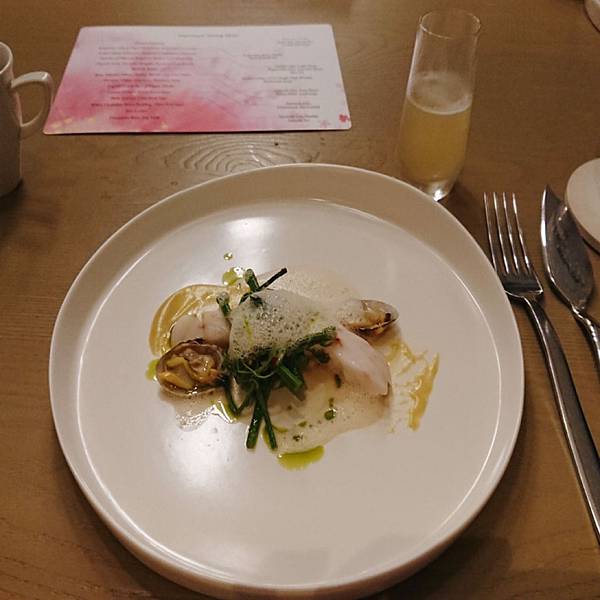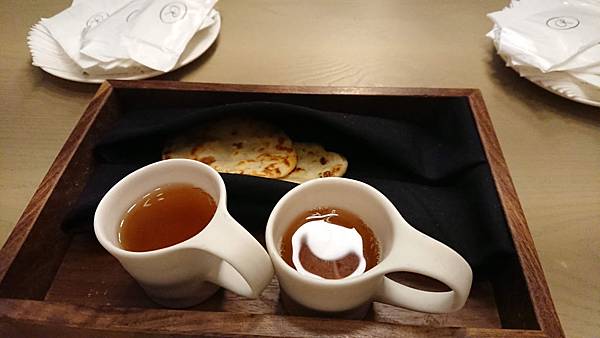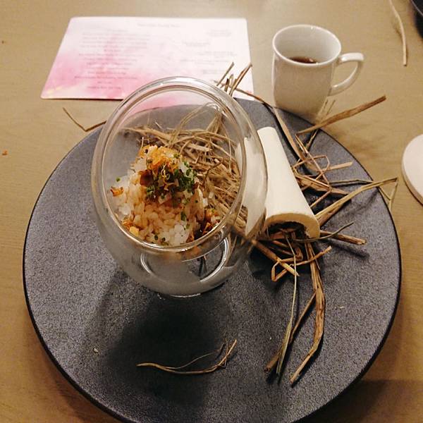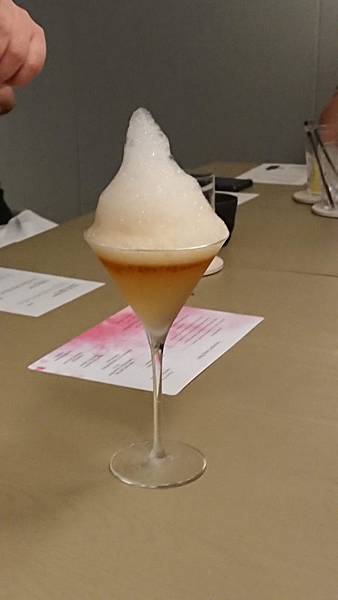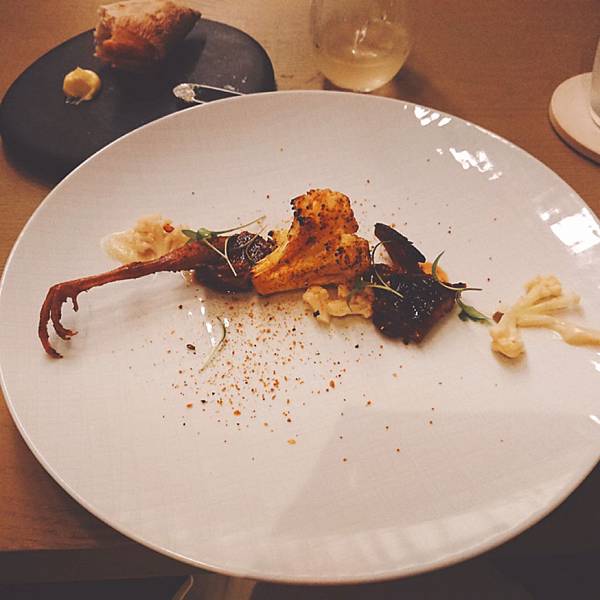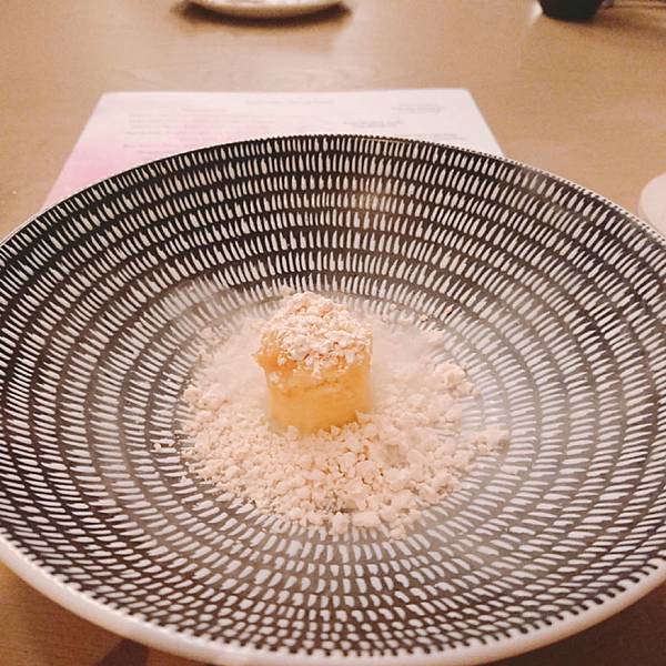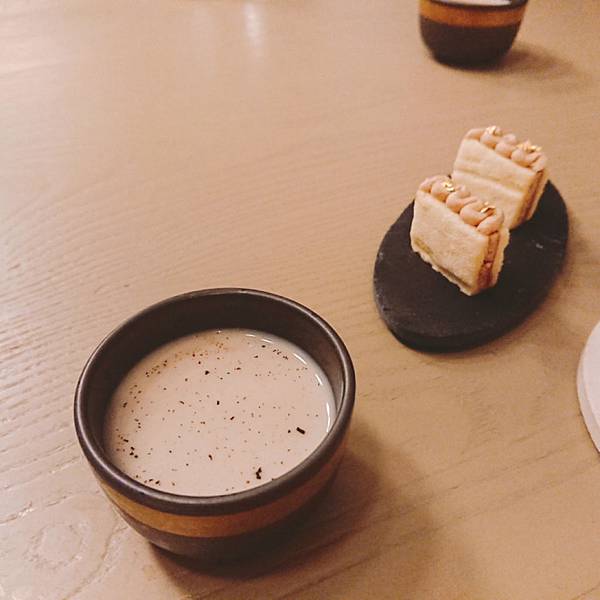 第三道是麵包配奶油, 麵包毫無疑問的紮實又充滿香氣,剛加熱過暖暖地散發著熱氣。 但是令雪咖啡驚艷的就是旁邊那原本不起眼的奶油球了, 他不是一般的奶油啊! 是充滿牛油香氣(吃過牛油餅乾吧?紅色包裝,長條狀的?) 超級香,塗在麵包上,因為熱氣而融化, 在嘴裡的油脂酥香~ 一坨奶油也可以讓我這麼愛啊! 第四道燒烤鵪鶉,還可以看到左邊的鵪鶉爪子, 鵪鶉烤得很香,骨頭也酥酥脆脆, 搭配日式的咖哩粉, 彷彿把場景從法式麵包又切換到燒烤居酒屋 . 看到上面三朵白花椰菜了嗎? 連小小的花椰菜都很搞工, 左右兩朵是用四川泡菜的方式下去醃的,酸酸甜甜, 中間那朵是用烤的 (不過是三朵花椰菜,還換烹調方式呀) 第五道燒烤小牛胸腺,這個食材其實一般出現在法式料理, 但是今天主廚做了燒烤,延續日式居酒屋風。 . 什麼是小牛胸腺呢?英文菜單上寫「sweetbread 」但是並非什麼甜麵包啦, 指的是腺體, 而且是只有3到6個月的小牛靠近胸口的腺體, 長大就萎縮掉,沒有了,因此十分珍貴呢。 . 那個燒烤醬甜甜鹹鹹,上面滿滿韓國芝麻葉, 小牛胸腺很滑嫩,入口即化, 口感上有點像鵝肝醬那樣順滑綿稠, 而且因為是從小牛身上取的毫無腥味喔 搭配的是萊姆酒為底,加上甘蔗汁和椰子水,椰子的香氣充滿口中,帶著南洋風情, 但是個人不太愛萊姆酒的味道, 趁機節省酒類扣打,喝幾口試味道就推給老公了 第六道煙燻墨西哥辣椒湯, 正當雪咖啡快被接連的美酒擊沈,根本漂浮在酒精泡泡上的時候, 出現了救星! 酸酸辣辣的墨西哥辣椒,煮成溫熱的湯品, 搭配豬頰肉和爆甜水果玉米, 暖胃又暖心, 我們來到熱情的墨西哥啦 (酒有醒50趴,可以繼續喝了) 第七道,牛骨髓豬油拌飯櫻花蝦, 人家說金窩銀窩不如自己小窩, 環遊世界後暫時回家歇歇腳,來點豬油拌飯吧 (話說雪咖啡每次去歐美玩,都超想念台灣的白米飯啊) . 對滴,旁邊那塊白白的不是什麼陶瓷裝飾擺盤, 他是牛骨頭啦! 牛骨髓的味道十分濃郁厚重, 拌上油膩香氣的豬油, 最後在白飯灑上酥酥脆脆櫻花蝦。 非常下飯好吃,來個大碗公也可以扒光光吧 . 據同桌友人表示, 上次來牛骨髓是配麵包吃,他覺得偏油膩厚重, 這次搭配白飯更好吃呢 搭配的酒品是本次雪咖啡覺得最奇妙的一杯, 威士忌煮蘑菇湯, 杯子靠近時可以聞到很香的蘑菇味, 入口又有威士忌的木桶煤炭酒精味, 搭配在一起說不出的奇妙啊 (但可惜不是我喜歡的那種,可能我本身就不愛威士忌吧) 第八道石斑魚配海瓜子龍鬚菜, 石斑魚很好吃、醬汁也好吃,算是比較清淡的一道 因為是吃魚,這杯就是用史密斯琴酒和白酒為底,加上柚子調出來的飲料, 酸酸香香的,我很喜歡,特別跟它合照一下 第九道和第十道是一起的羊肉料理, 這是羊肉湯和烙餅, 那個羊肉高湯富含滿滿的羊肉香氣,一上桌就征服大家的嗅覺, 濃郁香醇卻不厚重,幾乎把油脂都過濾掉了, 齒頰留香卻不在口中留下油膩感, 暖暖的好舒服,有草原的感覺呀 第十道是羊腿加香料優格和鷹嘴豆泥, 羊腿又嫩又香,處理得很好,沒有腥味, 切片後可以包在上面的烙餅吃 . 天蒼蒼野茫茫,風吹草低見牛羊 吃羊腿嘛,搭配的是本次雪咖啡最愛的酒品(第二名應該是柚子或玄米茶)琴酒底,有著淡雅的玫瑰香, 酒精味道很沒有存在感, 我覺得是女生會喜歡的一酒品, 當然我就把它喝光光啦 (然後我真的快不行了,平常都是一杯倒呀) 接著進甜點啦!第十一道,茉莉冰沙奇亞籽然後有梅子的香氣, 和前一道羊腿搭配得很好, 茉莉的香氣和梅子的酸剛好可以洗掉一些厚重感 . 搭配的是本次最後一杯酒,左上角看起來像茶杯的東西, 琴酒底,茉莉花茶和香蘭, 其實到餐點的尾聲,酒精的比例調得很淡了, 更多的是飯後熱熱的茶香 第十二道是很有名的甜點,白巧克力麵包布丁搭配急速降溫的鴨肝,弄成像慕斯那樣的口感, 在一道甜品中有冰(乾冰和降溫鴨肝)、熱(溫熱的麵包布丁)、鹹(鴨肝的鹹) 和甜(白巧克力和布丁的甜), 之前沒辦法想像怎麼再小小一口中又冷又熱又甜又鹹,重點是還交織得很完美而不突兀衝突, 好好吃喔,怕甜點太甜膩的男生也讚不絕口, 在我嘴裡留下很顯明的味蕾印象 中間穿插送來的是安可場的酒單,但是我完全不行了, 再喝,老公就要扛我回家了⋯pass 拍一下別人點的伯爵茶魚子醬馬丁尼 迎來最後第十三道菜(開胃菜番茄冰沙不算就是十二道啦), 三奶蛋糕和米糊奶豆漿, 三奶蛋糕就是含有鮮奶、煉乳和奶油等,反正就是三種奶製品啦,就是又甜又帶著奶香, 我也喜歡(反正我就是愛甜食) 一頓飯吃下來這麼多道菜,從七點吃到十點呀⋯ 還請主廚和當日的調酒師幫我們在菜單上簽名 . 這次又破雪咖啡的餐飲價位紀錄了, 一個人含酒水和服務費約4400元。 但這樣的收費其實也不算太貴, 畢竟光調酒就喝掉七杯耶, 總菜色含前菜更達13道, 而且每道都吃得出精緻用心,滿注著主廚對於料理的愛和想傳遞美味食物的心情, 最後看工作人員大合照, 我還偷偷數了一下,含主廚、調酒師、服務生等等,一間座位不過二三十人的餐廳,工作人員也是二三十人呀⋯ . 總之是一次很美妙的體驗, 美味的料理、好喝的餐酒、舒適的氣氛 (再次強調平常一杯倒的我,從頭喝到尾耶,可見我有多愛了) 像是跟著主廚旅行一周回來, 帶著飄飄然的醉意,跌落沙發上, 進入夢鄉時嘴角還帶著笑 . 地址:台北市中山北路二段39巷3號B1(晶華酒店地下一樓)電話: 02-2521-