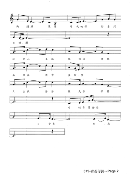 阮的人生路 親像這條路 無依無偎靠 真寂寞 人生長落落 攏是在孤獨 站惦青苔仔路 日子有那無