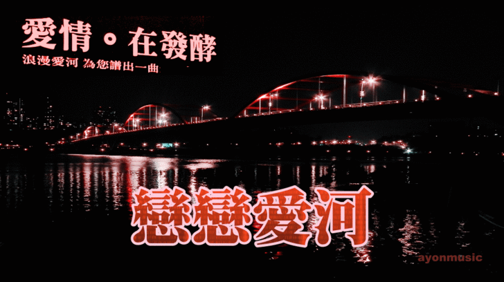 【戀戀愛河】(閩南語) 作詞/作曲:阿勇(ayon) 演唱:愛唱 星光月暝 水面燈火 閃閃熠熠 輕舟過去 笑聲樂聲 歡歡喜喜 微風輕輕吹起 陣陣吹來 愛情味 浪漫美麗景緻 雙雙對對 陶醉愛河裡 *你我相逢 你我相逢佇愛河邊 相依相偎 相依相偎啊訴情意 戀愛滋味 戀愛滋味是真甜蜜 愛情風 微微 纏纏 戀戀愛河 綿綿無了時 《創作緣由 》 各地河流經過整治 處處燈光幻影 水上 船來船往 岸邊榕柳垂蔭 微微的風 輕輕吹拂 很適合談情說愛 於是創作此曲 阿勇的歌-540 戀戀愛河 (閩南語)waltz 2013 愛唱