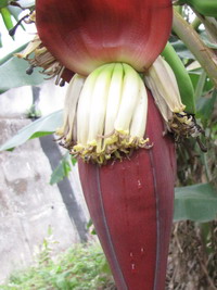 原產亞洲南部,分佈地從中國南方到印度喜馬拉雅山山麓的香蕉,相傳早在羅馬帝國第一代大帝的侍醫便以它入藥,因而被稱為Musa sapientum Linn,Sapientum指的是賢者、創造者,也因此,香蕉成為羅馬帝國王公貴族的上等食品。 漢人早在漢朝的《史記》,就記載過這種水果,名為天苴、芭苴,到了晉朝的《名醫別錄》及《南方草木狀》,則稱為甘蕉,明朝的《本草衍義》稱芭蕉,清朝的《本草綱目拾遺》才開始被稱為香蕉,並且通稱到了現今;歷朝歷代,人們對香蕉有些什麼樣的認知呢?在《本草綱目》中說說得最具有代表性:「按陸佃埤雅云:蕉不落葉,一葉舒則一葉蕉,故謂之焦,俗謂乾物為巴,巴亦蕉意也。芭苴,乃蕉之音轉也。蜀人謂之天苴。異物志云芭蕉結實,其皮赤如火,其肉甜如密,四五枚可飽人,而滋味常在牙齒間,故名甘蕉。」 香蕉因甘美芳香而得名,香蕉的美味更令人難以抗拒,早已成為最受到人類歡迎的水果,因此在全世界熱帶、亞熱帶到溫帶地區都有人栽培,食用蕉的品種更多達數百種之譜,主要的品系大體可分為三大類:一、生食種香蕉(Musa sapientum LINN);二、煮食種粉香蕉(Muse paradisiaca LINN);三、矮種香蕉(Musa cavendishii LAMB)等。 曾經是早年台灣經濟命脈,有青果之王、果中皇后美稱的香蕉,大約在清代初葉,從中國的福建、廣東,隨著移民而來到台灣,由於果形呈彎曲狀,因此都被稱為芎蕉,在台灣,被栽種的食用香蕉約六十種以上,但較具經濟價值的香蕉,也只有三、四種而已,包括:北蕉、仙人蕉、粉蕉、台蕉二號…等。 除了香蕉之外,台灣中北部也有農民種芭蕉,芭蕉也是多年生草本,植株高約1~ 無論芭蕉或香蕉,都是無年輪的大型草本植物,直立的株幹常被稱為香蕉莖,其實不是莖,而是一層層由葉鞘組合而成的,由於芭蕉的外形和香蕉相當近似,許多人分不清楚香蕉和芭蕉之別,在這裡提供幾點做參考:香蕉的葉片較短、較寬大,葉背粉白色,芭蕉的葉片較窄長,葉背葉面同為翠綠色;香蕉整串香蕉的果實較大且為圓柱狀,芭蕉則較小且短瘦,香蕉的果指(一根香蕉)瘦長且較彎,熟前為青綠色,熟後變黃色,芭蕉的果指微彎且粗短圓鈍,表層帶有白粉,成熟時為紫紅色。 由於芭蕉吃起來略帶一點酸味,吃起來更具風味,但因芭蕉的果肉中仍有黑色的種子,加上產值較低,果實也較小,因此一直沒有成為主要的水果,大都是些非專業的蕉農,小規模地在田頭園尾種一些,自食為主,有多的才會拿去零售。 我喜歡吃香蕉,更愛芭蕉,很年輕的時候,就夢想要有一塊地種香蕉。 2007年決定買下北埔水磜子的三分地之後,心裡馬上浮起的盤算,就是一定要找個時間去屏東九如的台灣香蕉研究所,把一些特殊的、好吃的、罕見珍貴的香蕉都買回來種,2008年春天,我來到了香蕉研究所,親自選了旦蕉、玫瑰蕉、紅皮蕉、假呂宋蕉、李林蕉以及千層蕉,再加上從台南左鎮的西拉雅族人家要來的美人蕉,以及在彰化花壇買到的斑葉蕉,共計有八種之多,這些蕉全都種在園區最後方,和鄰家交界的擋土牆前,希望是這一片香蕉成林後,可以遮蓋住這一大片灰白的水泥擋土牆。 2009年1月,我突然接到台灣香蕉研究所的電話,詢問我買的蕉苗成長的情形如何?這是我從來沒碰過的情形,而我只是去買了十幾棵蕉苗,這個由行政院外匯貿易審議委員會之香蕉產銷輔導小組輔導成立的財團法人單位,不僅留下了購買人的完整資料,更關心我在北台灣種植的情況,希望來看看每一種植栽在北台灣生長的情形…,這是怎樣的類公務員呢? 我不只是好奇,更加上感動,約好了時間,我決定帶領專程北上的香蕉研究所品改組同仁,先去北埔一帶繞一圈,訪視多家農民所種的芭蕉以及香蕉,更同時尋找野生香蕉的種原,再回來看看救荒本草堂種的芭蕉,果然給了香蕉研究所品改組的同仁不少收獲,唯獨救荒本草堂所種的各種蕉,植株長得太瘦弱,經過診斷,原來是營養不良。 過去一年的救荒本草堂,其實還在跟荒草對抗,加上我一直不想用化學肥料,因此山上的芭蕉營養不良,我完全可以接受,接下來最重要的是找一些有機肥,多給那些蕉類多一點養份,好讓它們結出果實來。 沒想到開春之後,忙著跟春天蔓生的雜草對抗時,竟然發現有一株又瘦又小的芭蕉結果了,這株芭蕉高不到 這倒底是什麼蕉呢?查了查栽種記錄,發現應該是假呂宋蕉,台灣香蕉研究所的蕉種介紹是這樣說的:「因呂宋蕉易感黃葉病,在左鎮地區,許多農民已改種與呂宋蕉相似的假呂宋,具抗病性。屬印度種Mysore。假呂宋植株較粗壯,葉中肋紫紅色為其特徵。其產量較高,達20~ 沒錯,救荒本草堂唯一開花結果的蕉,就有「葉中肋紫紅色」的特徵,可惜由於營養不良,所結出的果實果指疏鬆且稀少,但還是讓我們期得芭蕉成熟時,想來,親嚐自己種植芭蕉的滋味,必然更香甜吧!