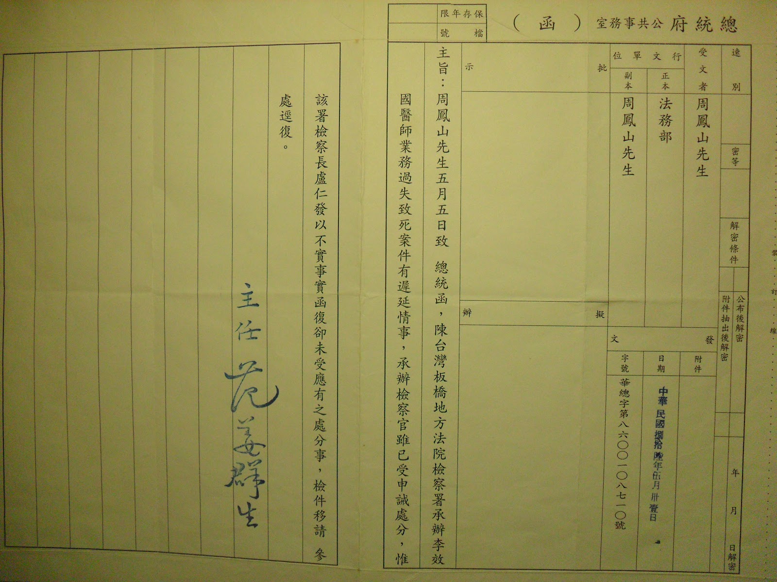 法務部長馬英九不但沒有依法【端正官葴】追訴檢察官瀆職,卻反過來發函給周鳳山小心誣告罪,有公函可憑,這是真實的事。